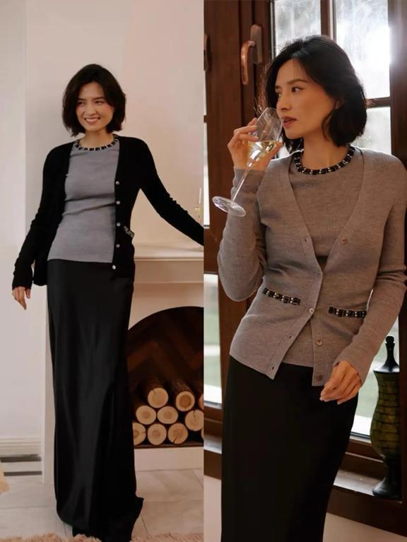修身針織開衫+高腰的闊腿西褲,上窄下寬的設計對於身材的包容性更強。黑色的高腰西褲、面料垂墜版型挺闊,可以顯得雙腿更加挺拔修長。