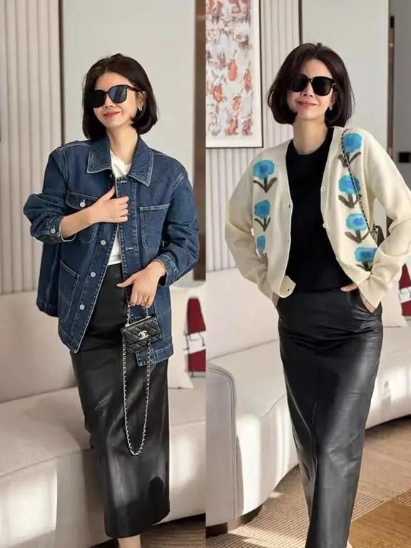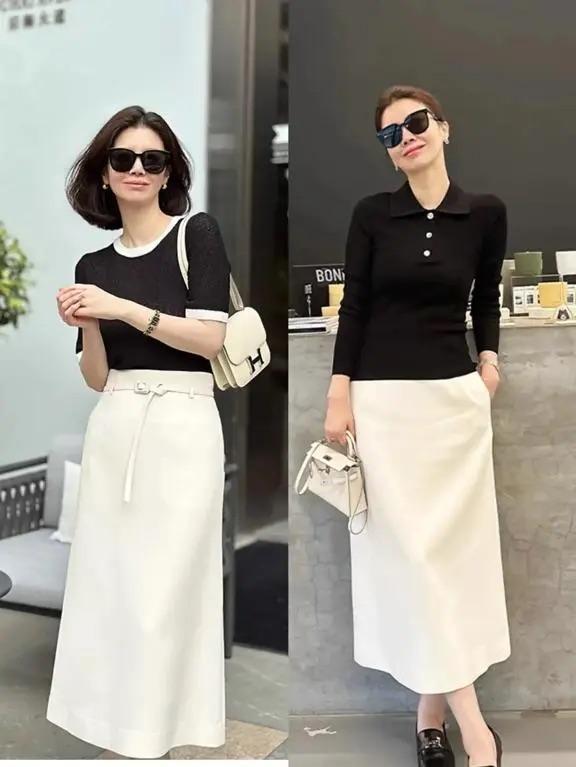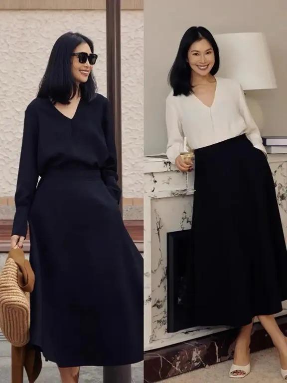 經典的黑白配,也太符合40+女性的氣質了。高級、大氣、時髦、耐看。修身的黑色針織衫,可以配高腰的A字形半身裙,上短下長的組合,抬高腰線很顯氣質。