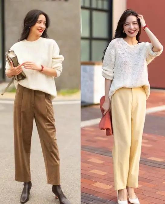 用修身的針織開衫來搭配高腰的闊腿西褲,會給人一種很大方又高級的美。像這種修身的針織開衫,來搭配高腰的闊腿西褲,可以表現出更舒適大氣的美。