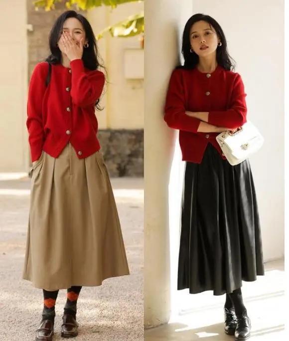 稍微寬鬆一點的針織開衫,來搭配大量感的半身裙,會更加適合體型有一點富態的人羣。隨着身材的豐腴,這種大量感的半身裙、可以具備更強的包容性,表現出華麗與大氣。