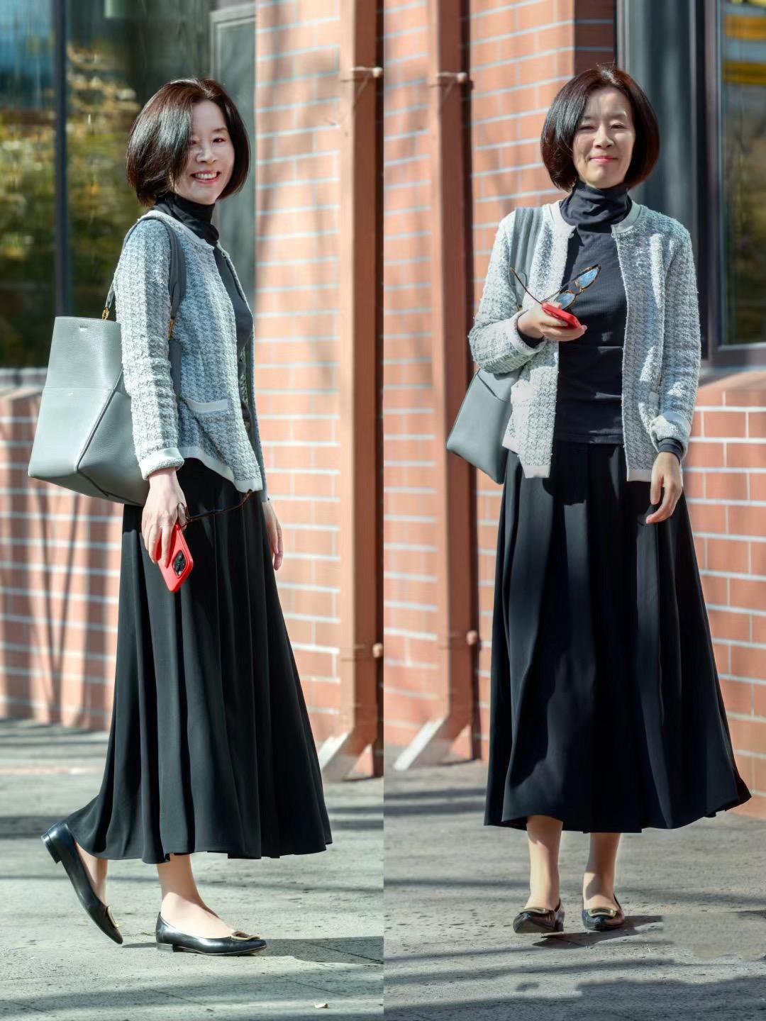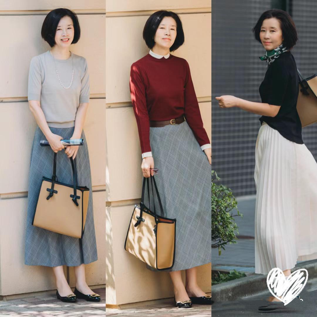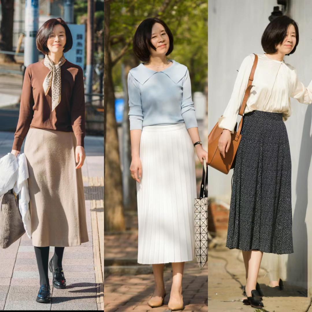 用短款的上衣,來搭配高腰的半身裙,是一種典型的上短下長的組合方式。抬高腰線、還可以包容下身厚重,對於中年女性的豐腴身材太友好了。