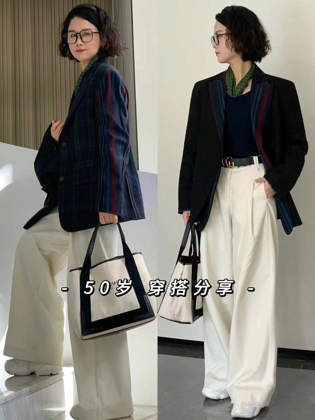 50歲女人的精緻,都藏在細節裏。精緻的貓跟鞋、看似不起眼卻是整體穿搭的點睛之筆。精緻的小西服修身有顯瘦,配闊腿西裝褲還可以優化比例。