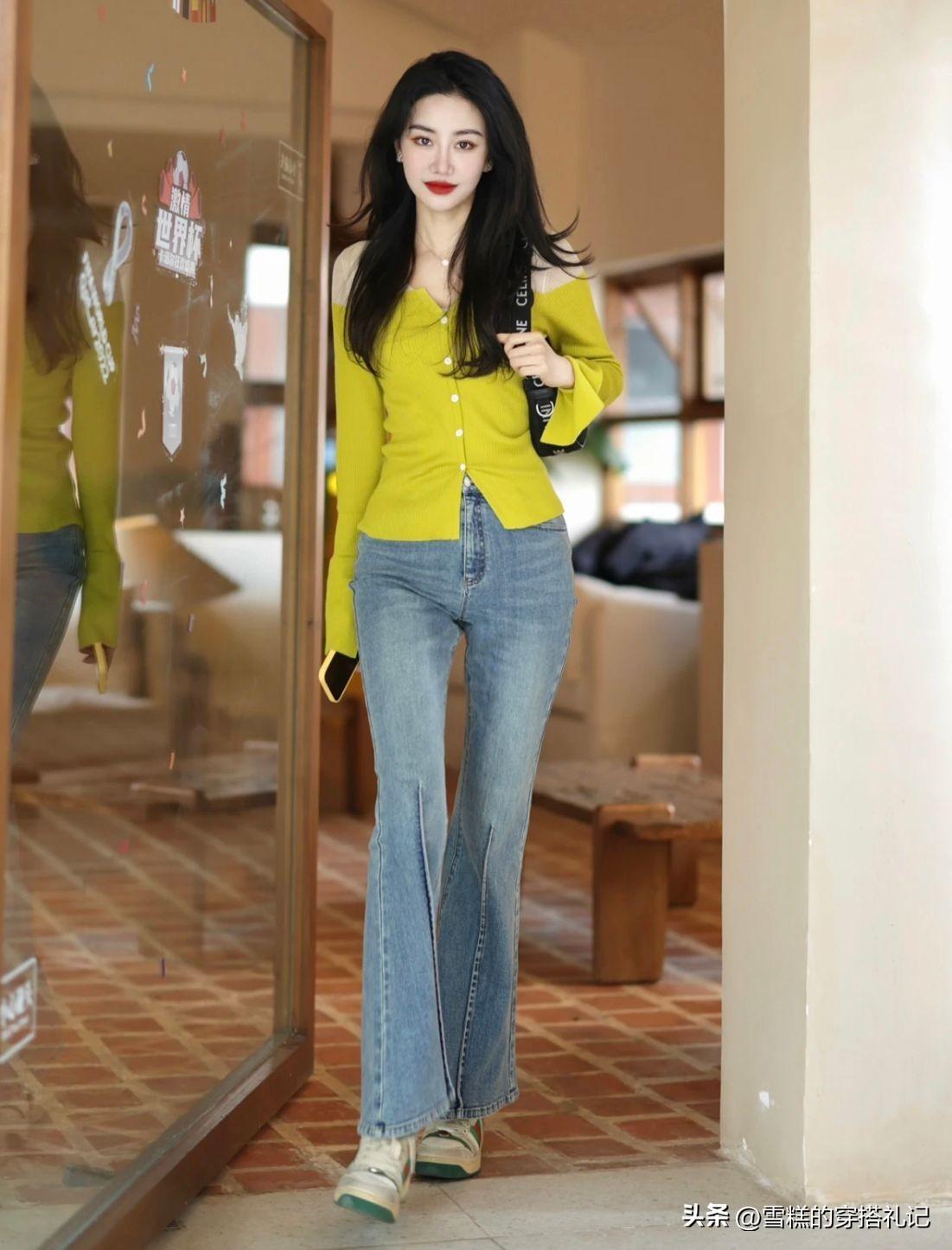 標準的比例效果是一定要展現出來的,所以在這裏推薦大家我們的馬蹄褲搭配的是高腰且偏長款的設計,那麼這個時候上衣就可以選擇與其爲對比色的短款上衣。例如像短款的小香風,又或者是一些比較修身系列的設計,最爲標準的上短下長就能夠被完美的彰顯出來。