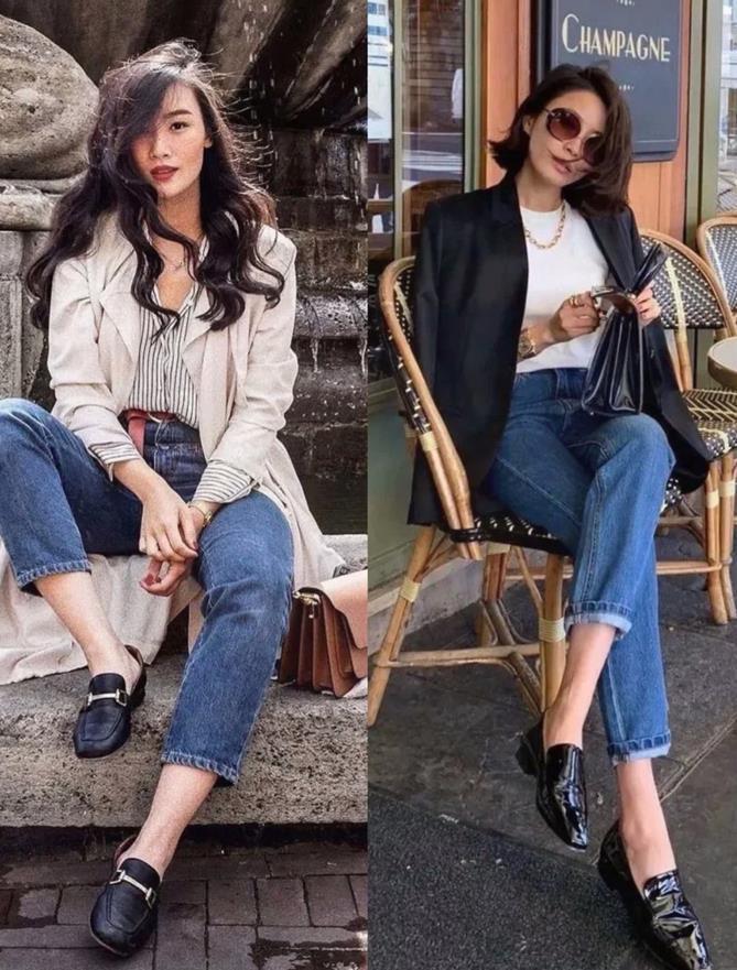 這一種搭配的魅力在於休閒和舒適,不管你選擇的是深色牛仔褲,還是淺色的牛仔褲,與樂福鞋相配,都能營造出一種休閒的氛圍,讓你在舒適與時尚之間實現平衡。