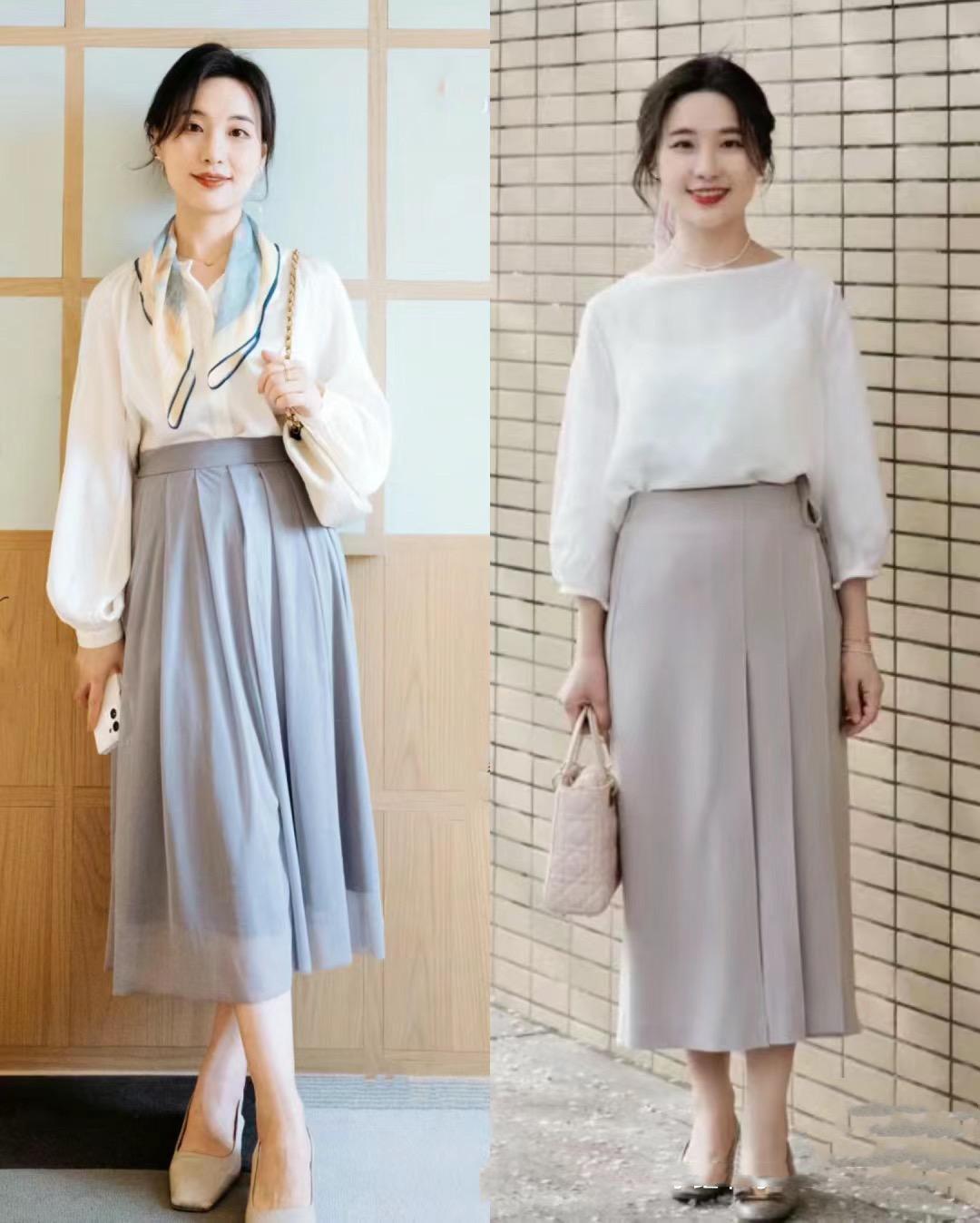 如果我們穿着輕盈的白襯衫,而白色襯衫的下襬又比較長的話。這時候我們可以選擇一種塞衣角的方式。將白襯衫的下襬塞進裙腰裏、就更加利落顯高。