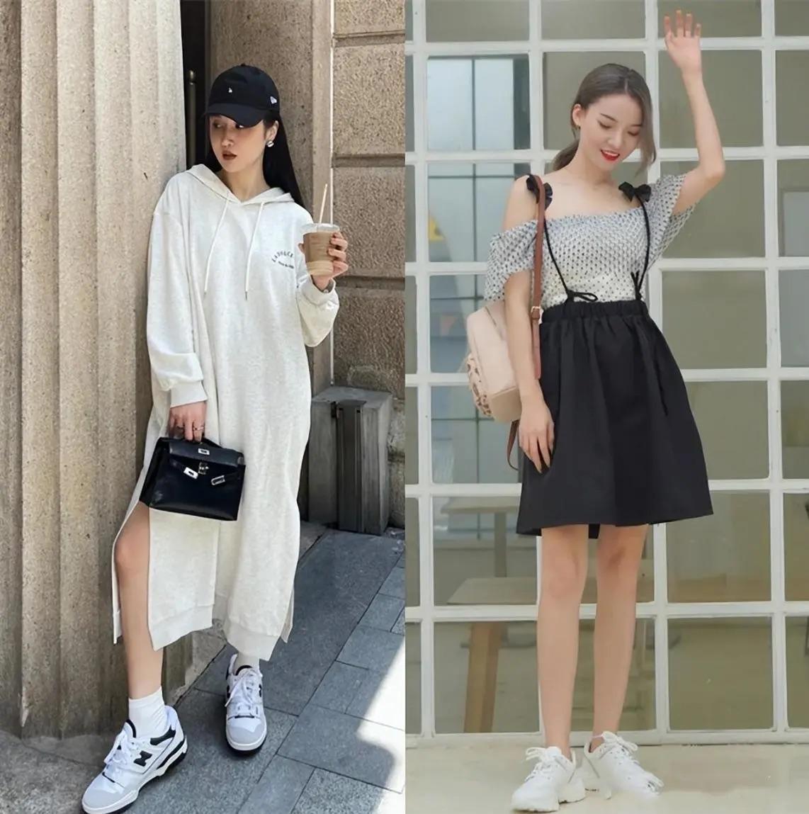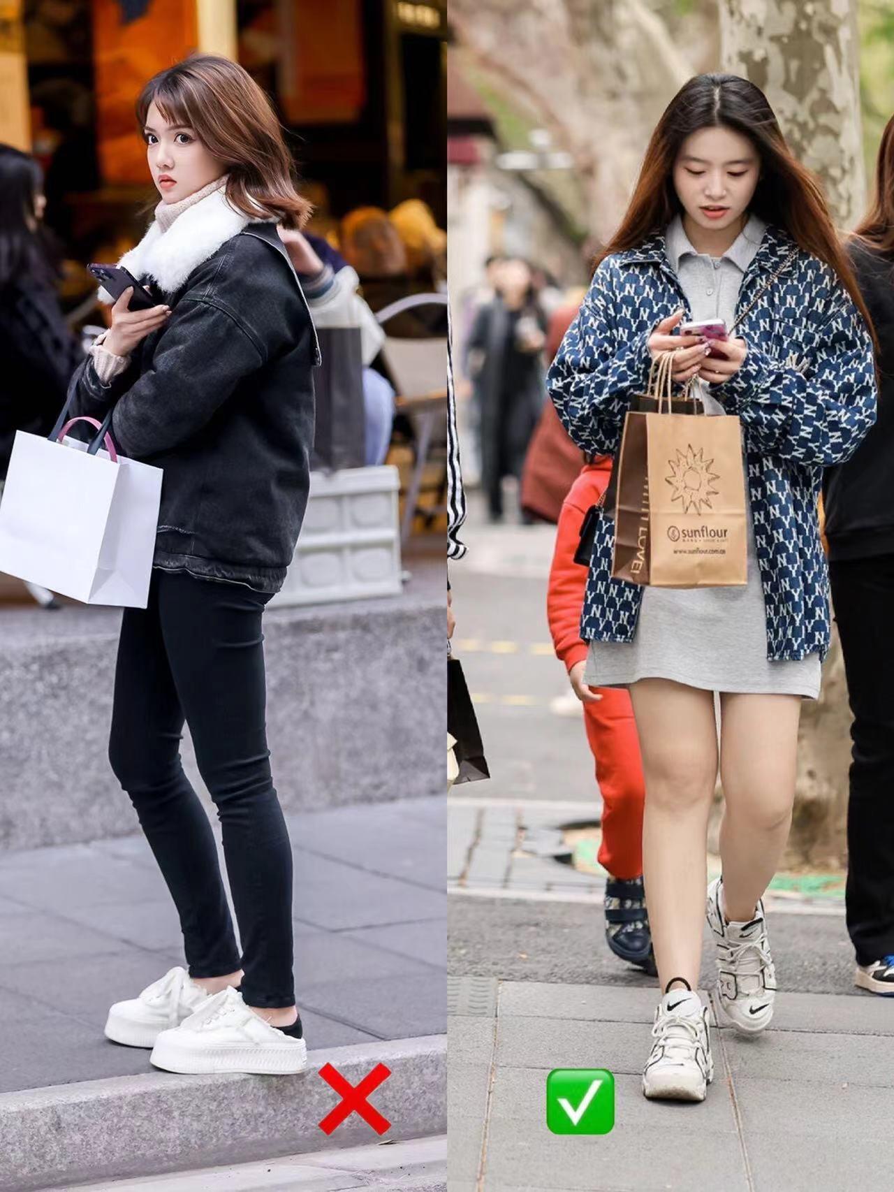 經典的小白鞋、就是常規的鞋底設計,並沒有任何的增高效果。而街頭潮人穿着的春季鞋,則具備了一定的顯高效果。