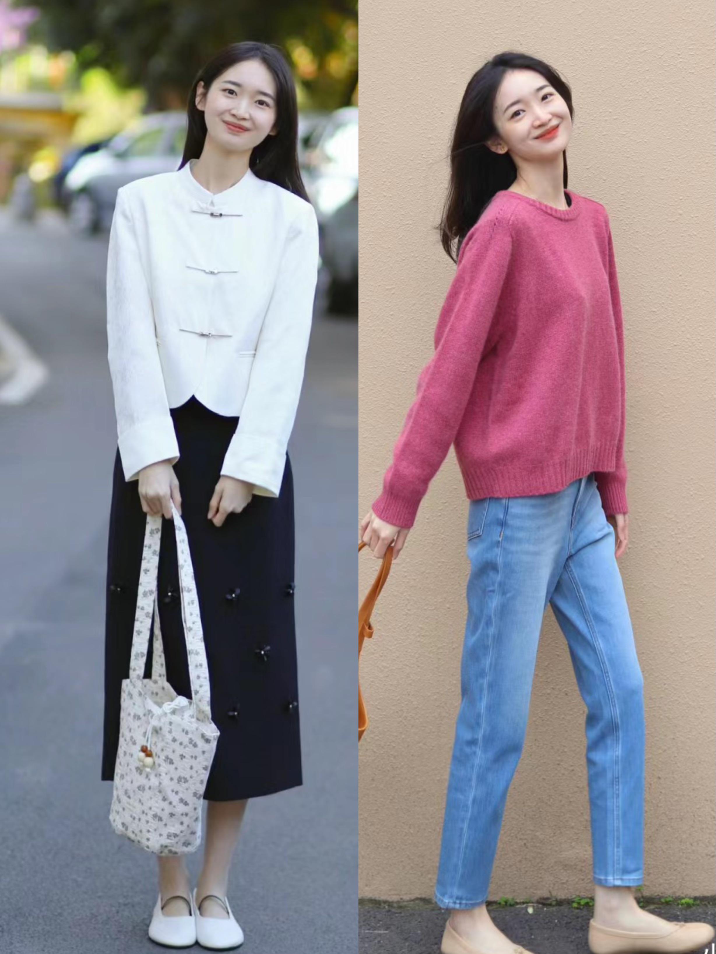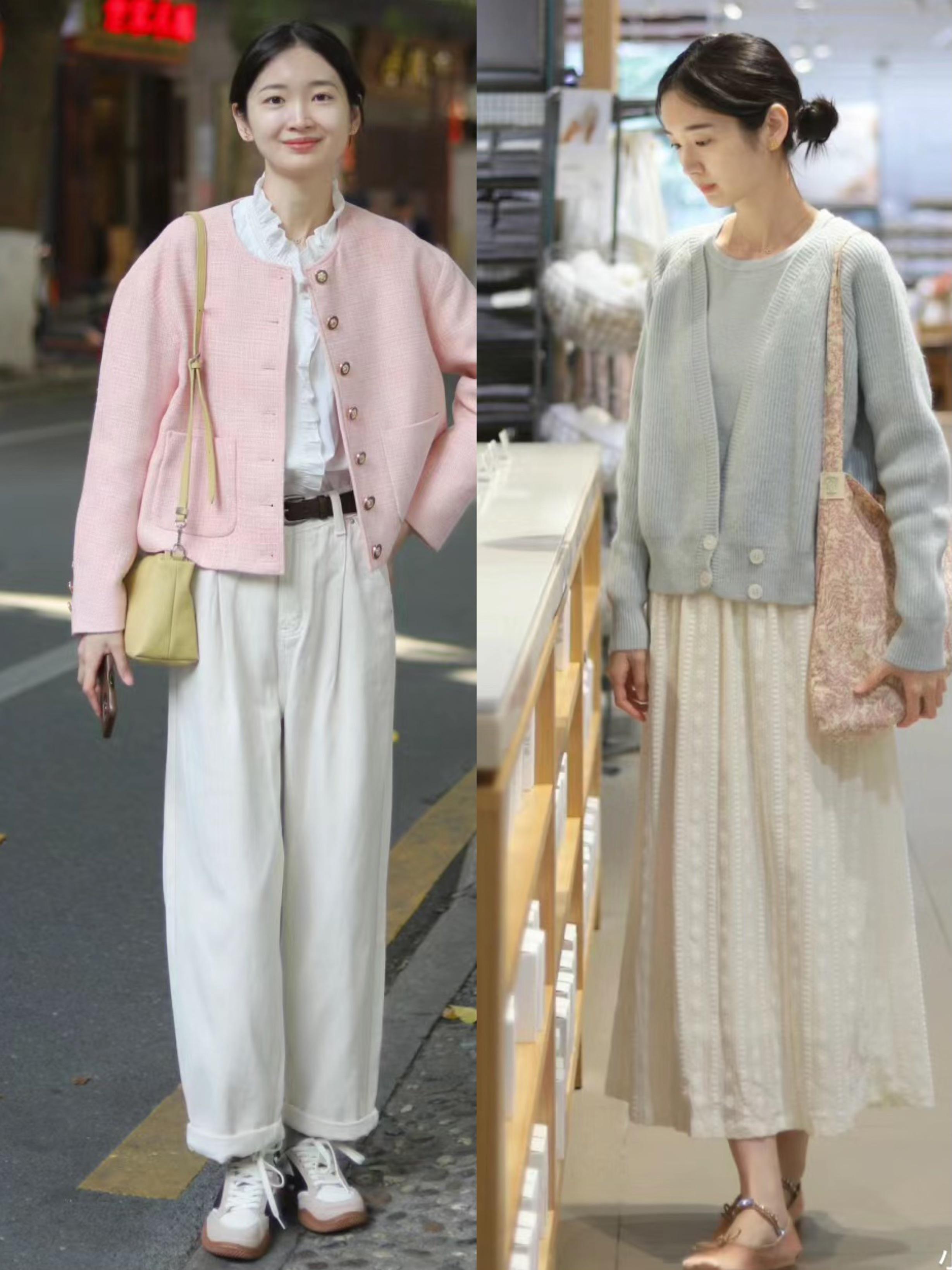 這位博主就是“人穿衣”的典範,看她的穿搭很容易總結出其中的規律。她的服裝配色都比較素雅,表現着低調且溫柔的美。