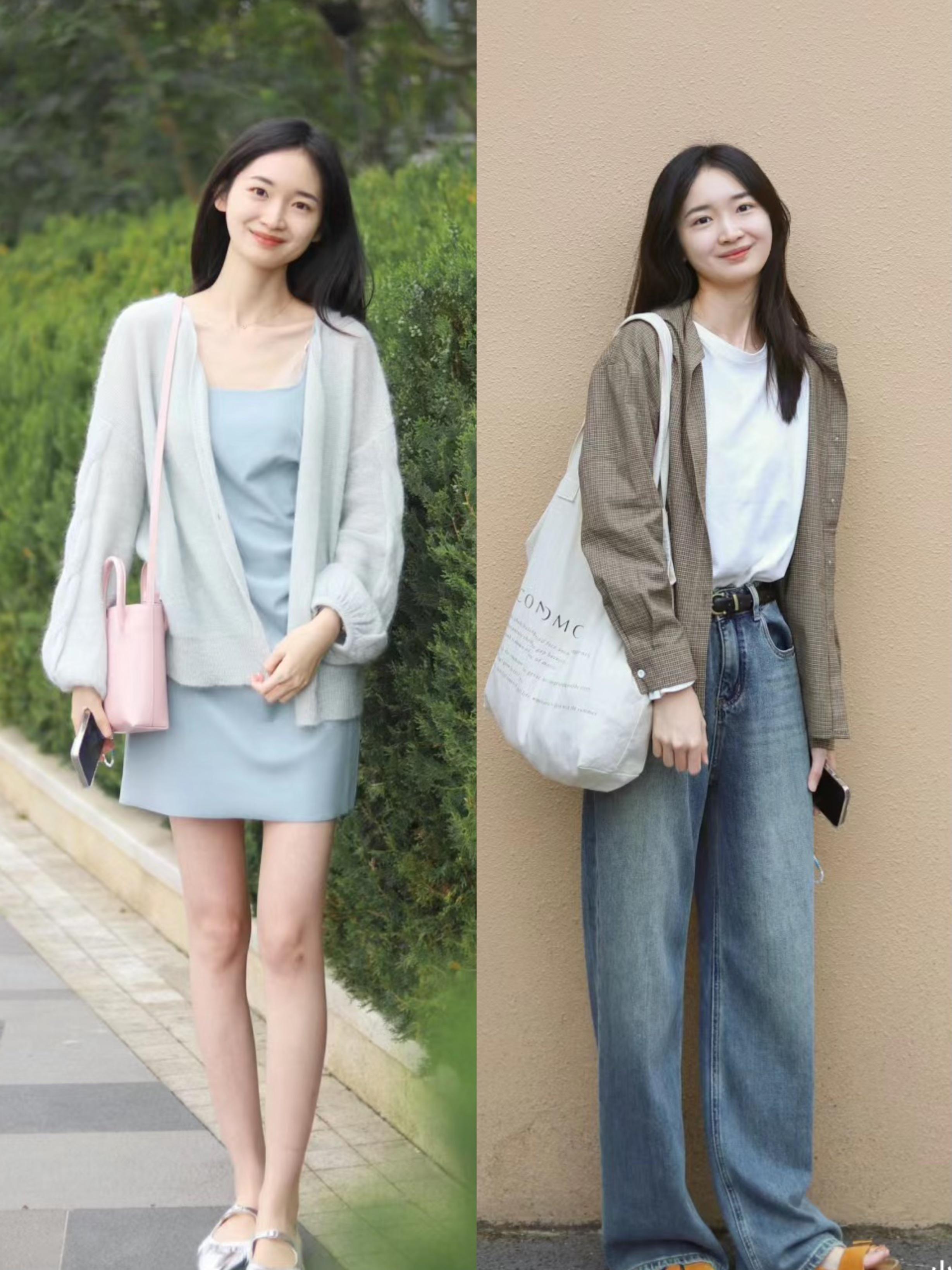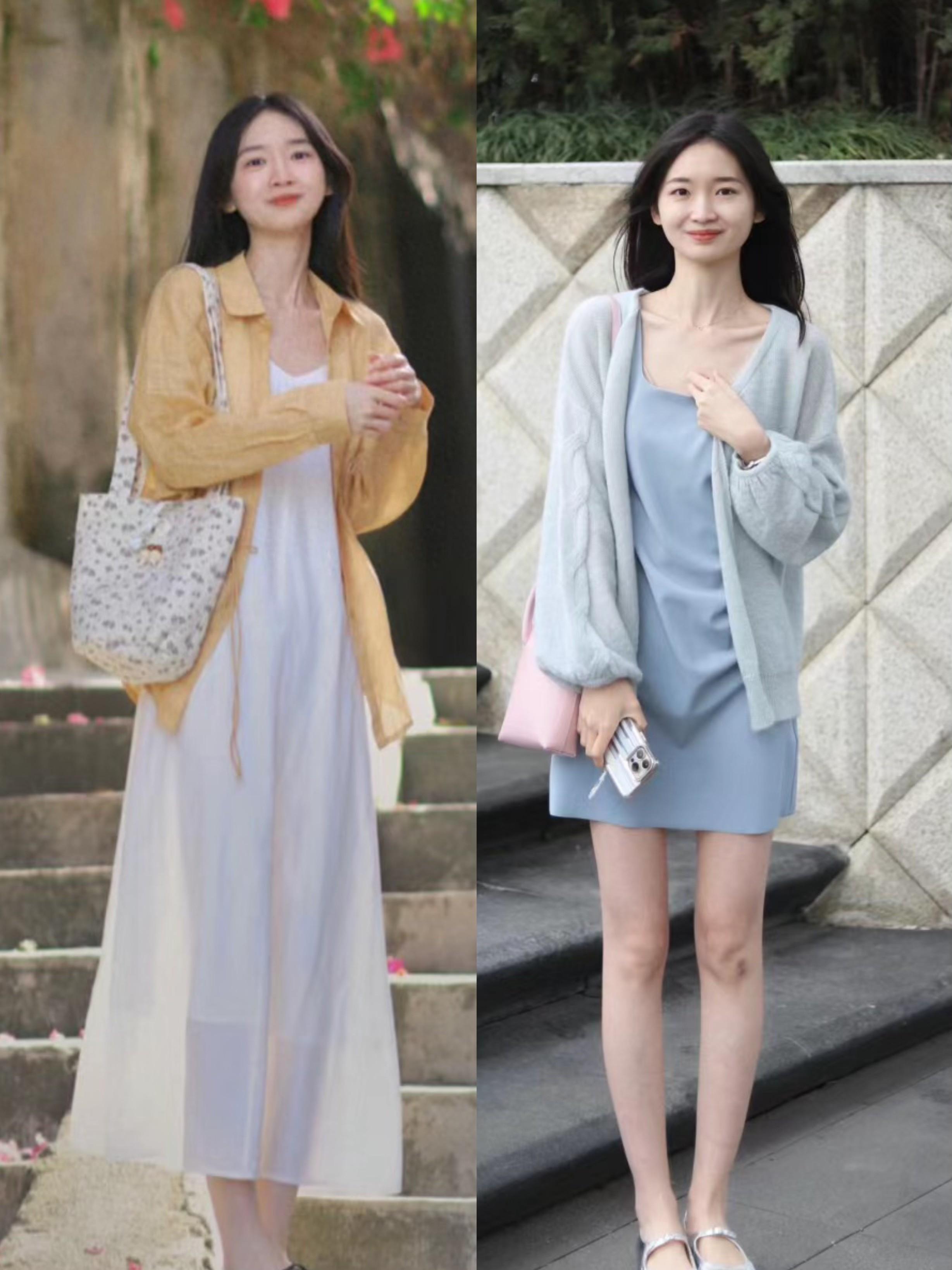 比如淺藍色系的針織衫配上同色系的吊帶裙,有一種溫柔又嫺靜的美。這種淺藍色系、自帶少女情懷,很減齡、很溫柔、也很柔和、很低調。
