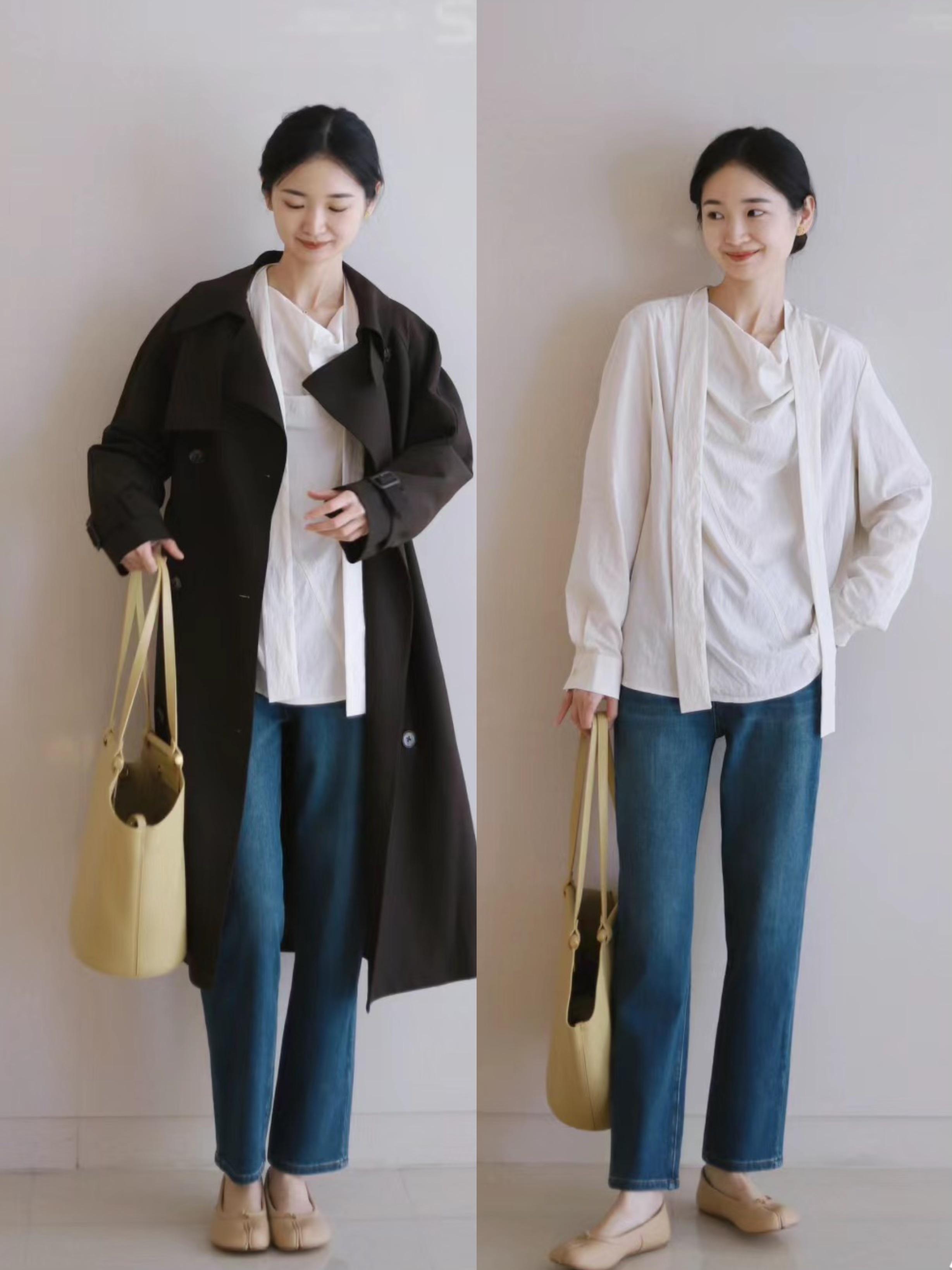 稍微個性一點的白襯衫,可以讓我們的穿搭更加時髦考究一點。領口選擇了一種堆堆領的設計,搭配飄帶點綴也很洋氣。