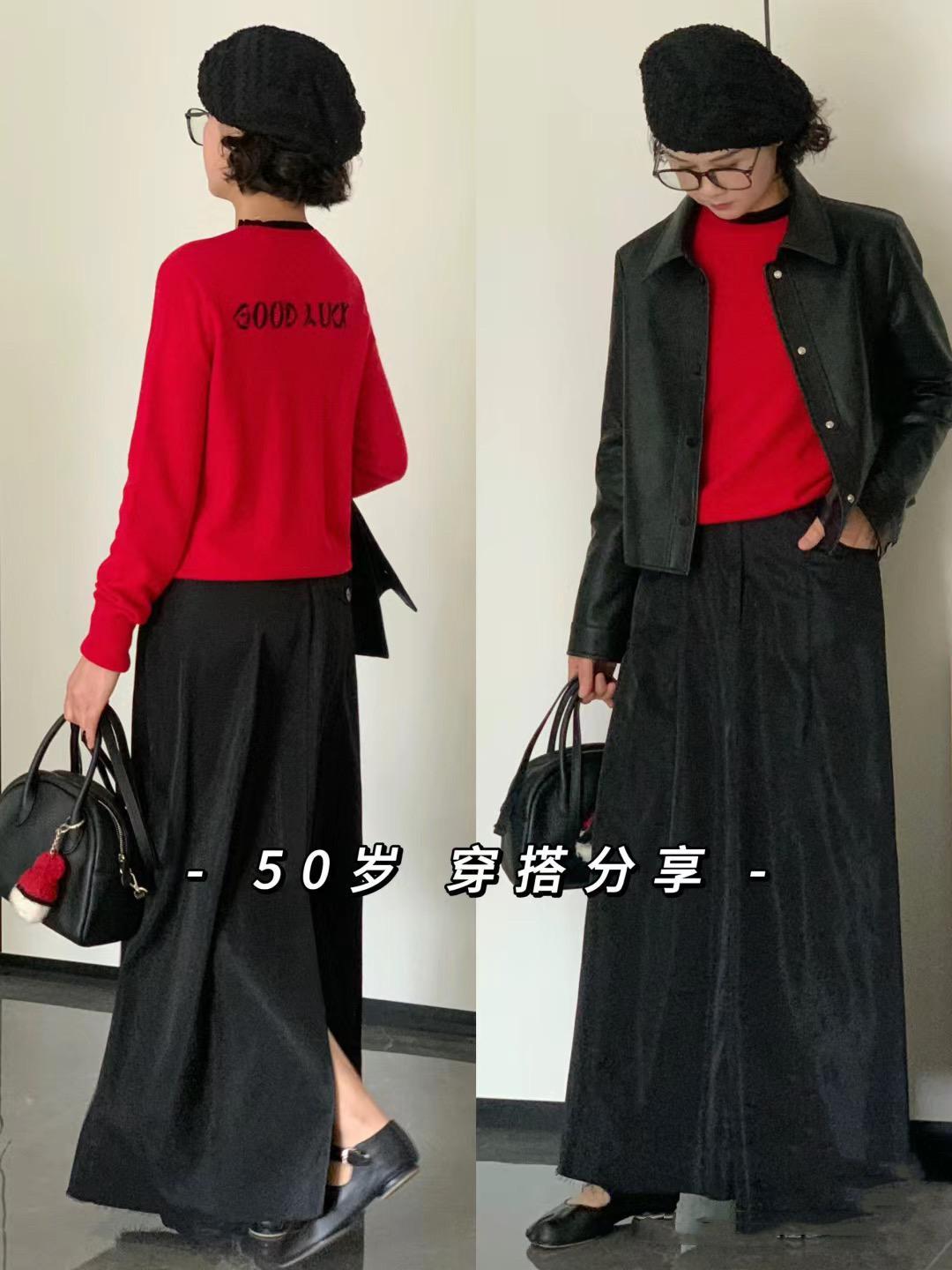 上短下長的搭配組合,纔是永遠都不會過時的。短款的紅色針織衫,有一種更加醒目的美,顯白又很提氣色。