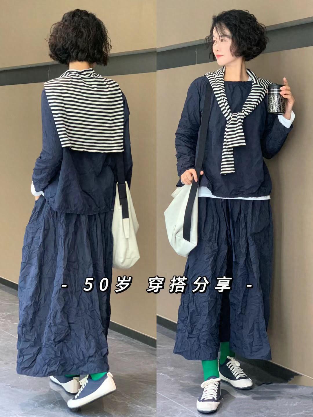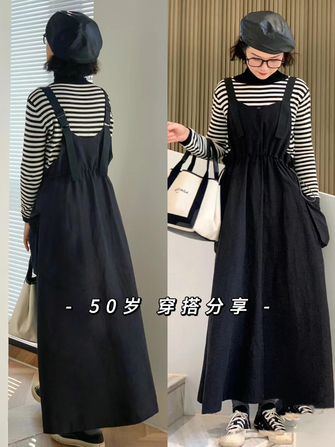 看起來有點文藝風的穿搭,並不是少女專屬呀。即便是50+的阿姨,也可以穿出屬於自己的腔調感。經典的黑白條紋針織衫,配上黑色背心裙,格外的文藝顯瘦。