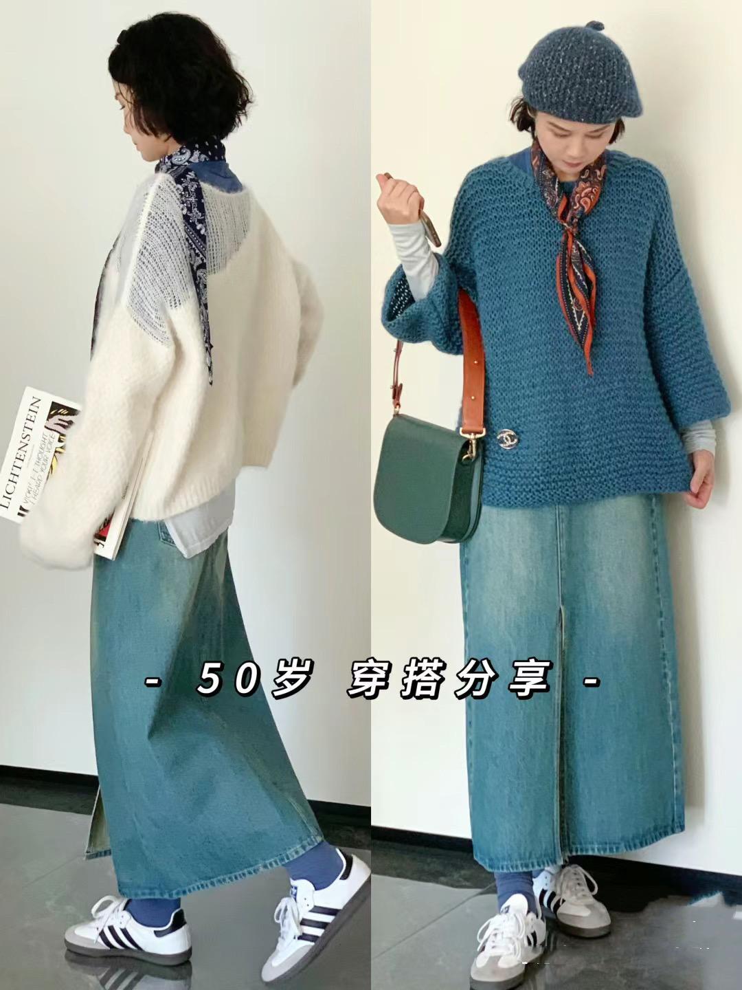 慵懶風毛衣,配上覆古風的牛仔半身裙,也是一組非常有腔調感的穿搭。不管是同色、還是撞色,都有一種更加醒目的美。