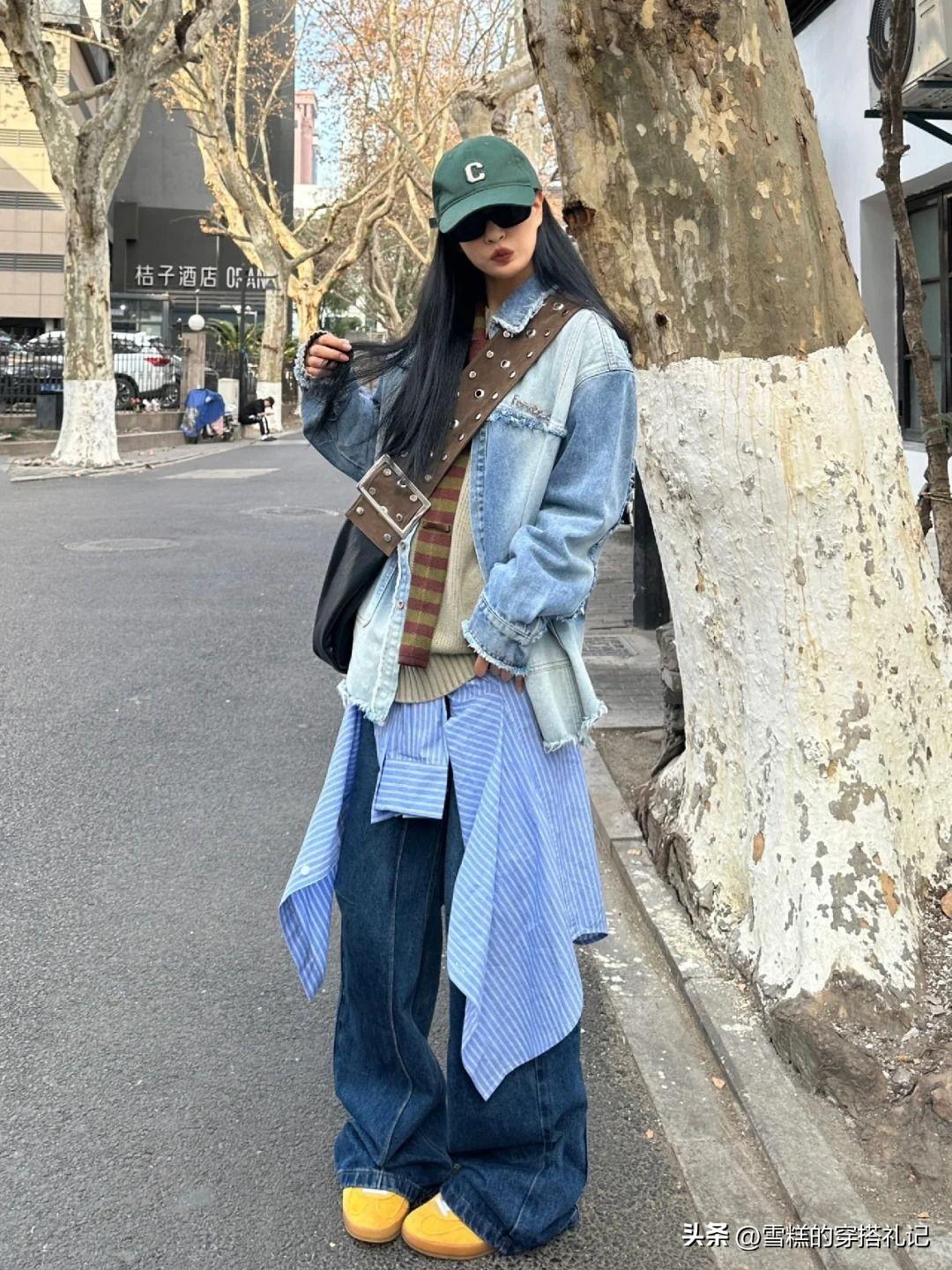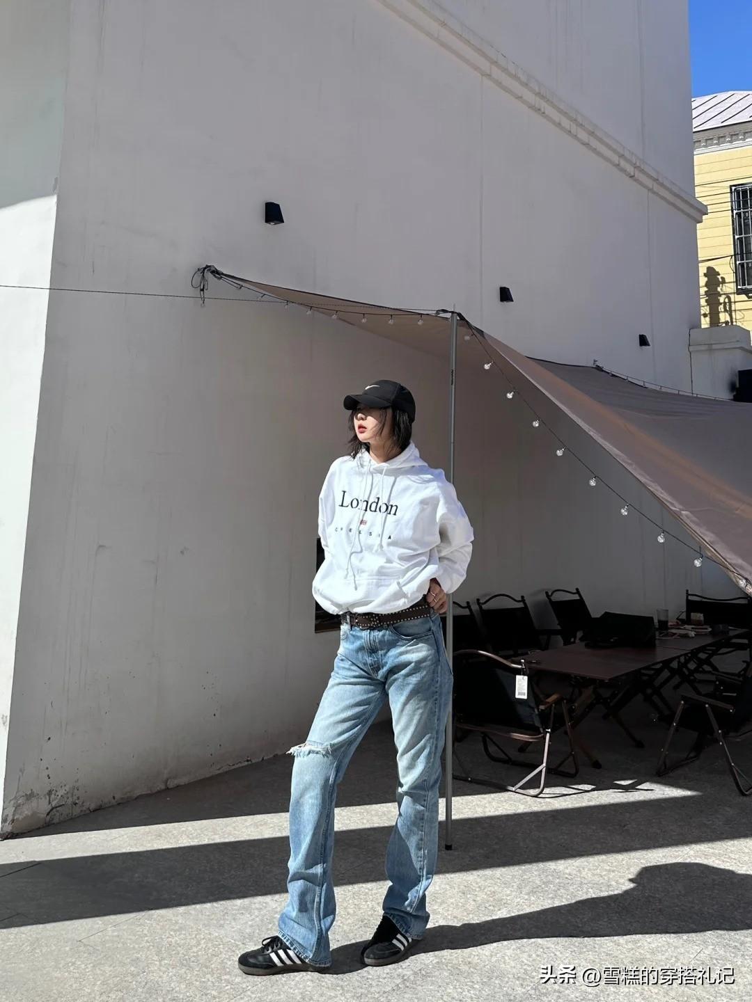 選一條比較休閒慵懶的牛仔褲可以將造型身處在一個休閒感十足的氛圍裏。上半身加上一件相同質感的牛仔外套,爲了強調視覺上的層次遞進,褲子的顏色可以更深一些,幫助達到更好的橫向瘦削,縱向顯瘦效果。