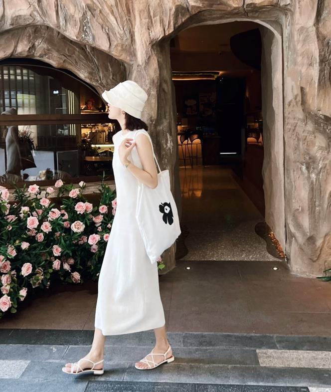 在春夏季節,你也可以選擇平底涼鞋配裙子,如果你選擇了長款裙子,可以選一雙簡約的平底涼鞋,黑色或者白色的都可以。