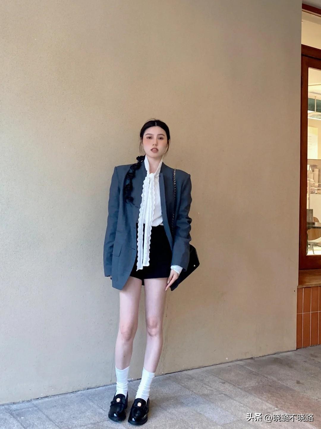 而在此之外,通過加入襯衫和絲襪的方式,把造型的完整性詮釋出來。如果整體都屬於純色或者基礎款,還能利用一些帶着個性色彩的配飾幫助提高造型的立體度,諸如潮人選擇的花邊領帶,亮麪包包等,看起來只是小面積裝飾,實際上卻大大增加了視覺觀賞效果。