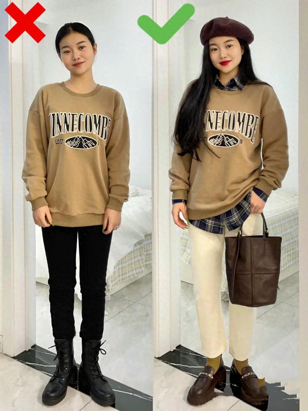 通過博主的穿搭對比,我們也很容易看出普通穿搭與時髦穿搭之間的區別。普通人穿衛衣,不會運用太多的小心思,直接搭配黑色直筒褲、厚底短靴,顯的有一些呆板、乏味。
