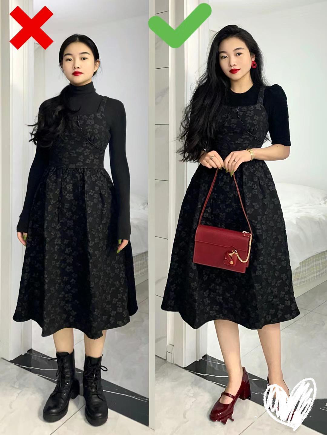 其實春天裏的搭配不需要那麼厚重,我們可以嘗試輕盈感的風格。黑色連衣裙疊搭半袖的打底衫,適當的露膚就更加洋氣。黑色連衣裙配酒紅色瑪麗珍鞋+同色系包包,精緻復古。