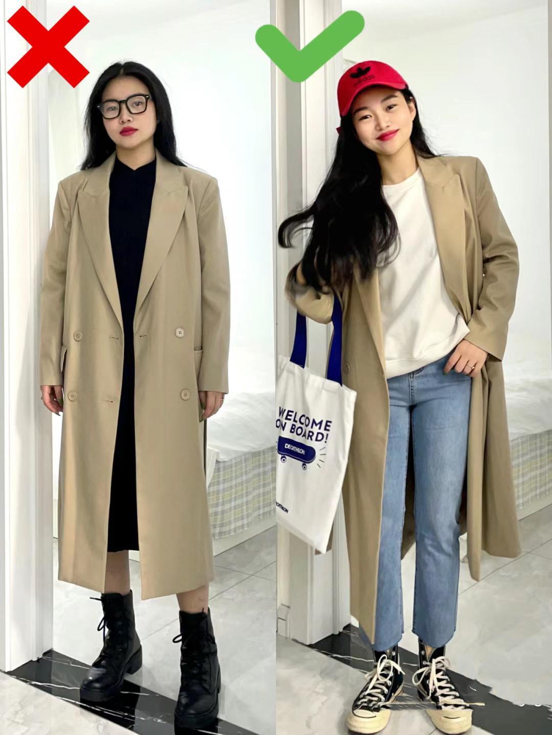 卡其色的風衣外套,如果直接搭配修身的黑色連衣裙來穿着,這種毫無特點、層次感也不強的搭配,很容易被淹沒在人羣中,路人感十足。