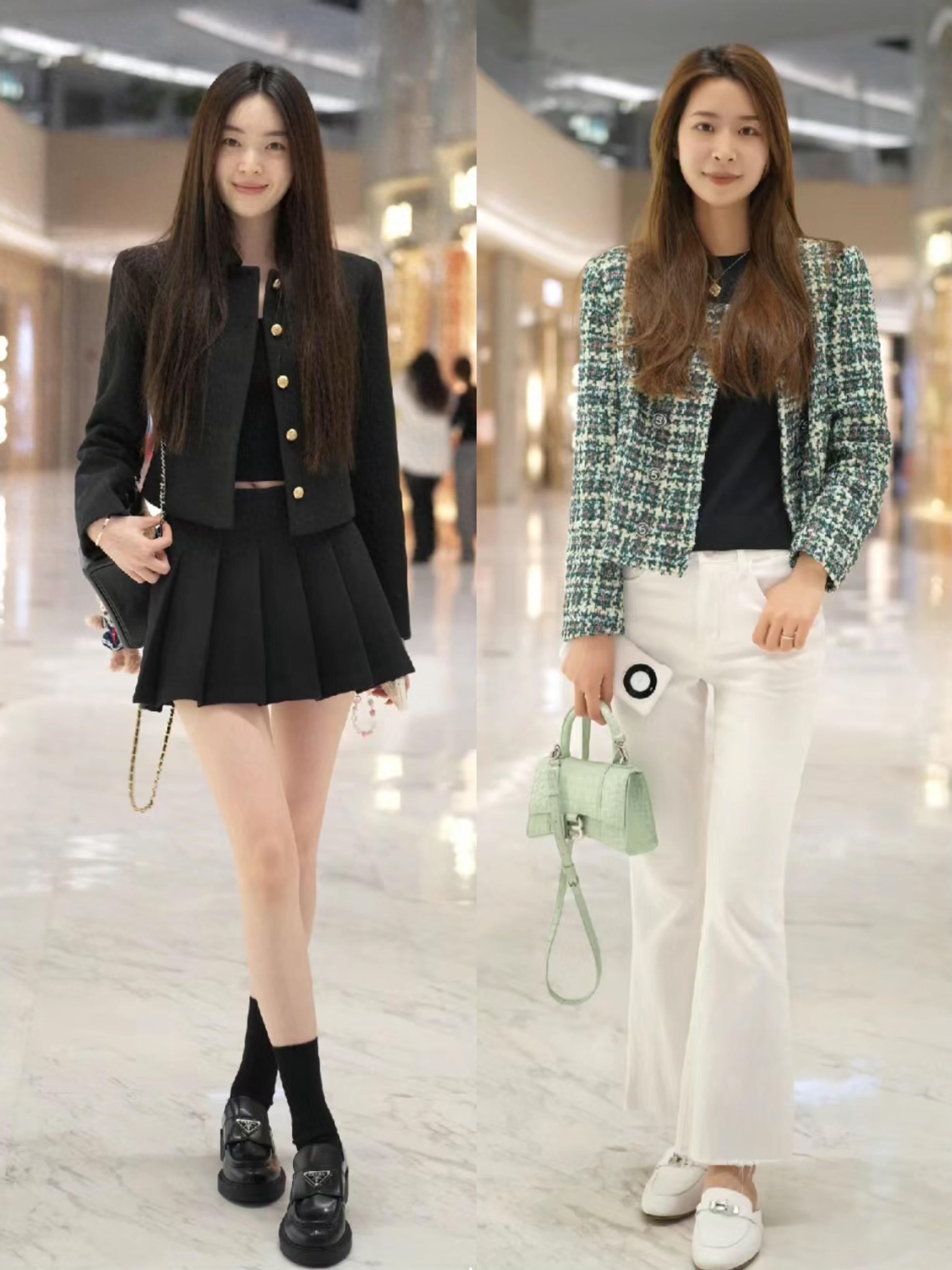 小香風外套大都是比較修身的款式,所以內搭可以適當修身一點。修身的內搭來搭配寬鬆的小香風外套,外鬆內緊的搭配、也更加洋氣顯瘦。