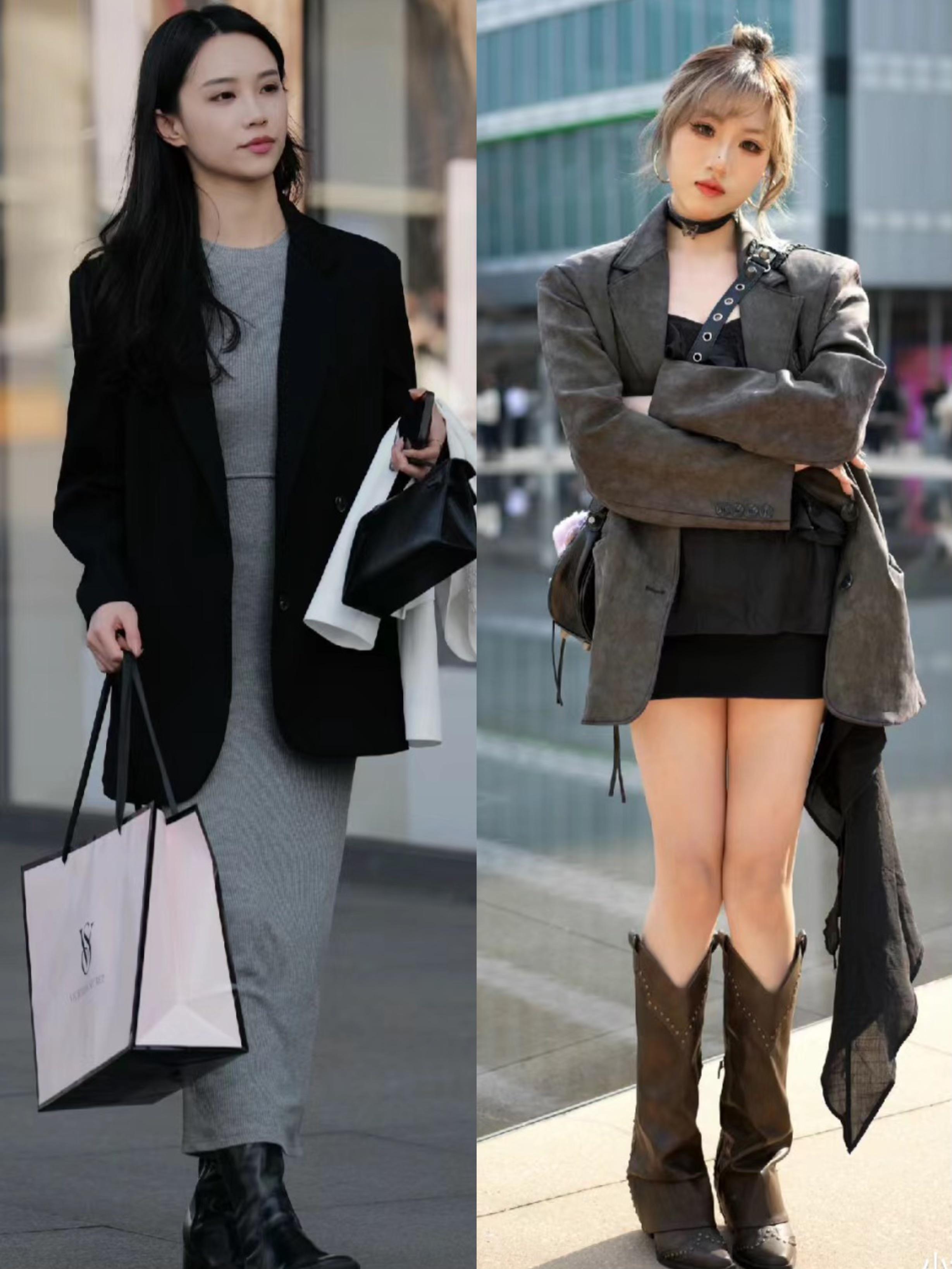 寬鬆的西服外套,小廓形的剪裁,更容易穿出時髦範。而且寬鬆西服外套配修身的小黑裙,儼然是一副外鬆內緊的搭配,慵懶大方還很顯身材。