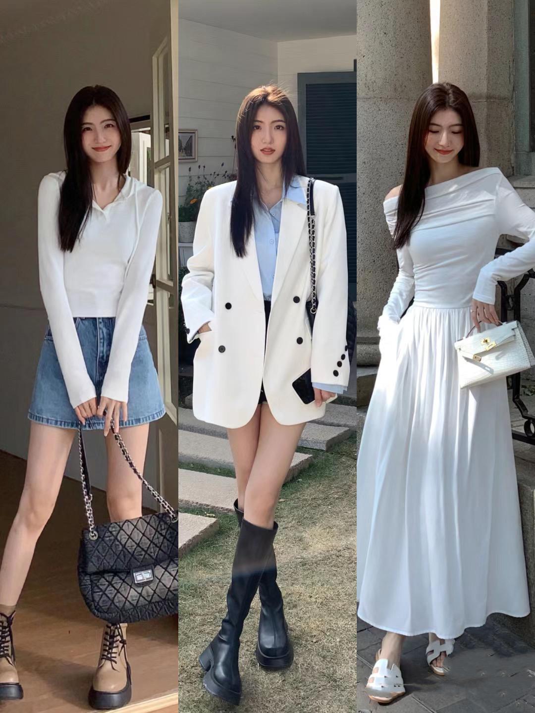 像這種寬鬆的白色西服外套,疊搭了藍色襯衫,乾淨而美好。用白色西服外套配黑色短裙,下衣失蹤的搭配方式更顯高挑,配厚底長靴,又酷又美還顯高。