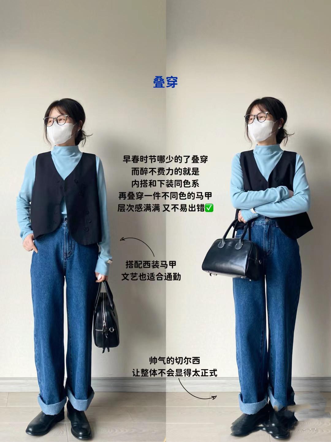 比如半高領打底衫+西裝馬甲的疊穿,下身選擇了以半高領打底衫同色系牛仔褲。這種內搭與下裝順色的組合,既擁有了高腰線、又拉伸了縱向比例,文藝通勤兩相宜,顯高又耐看。