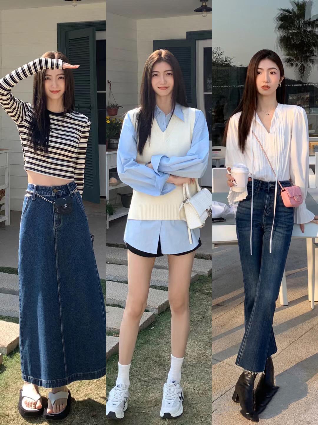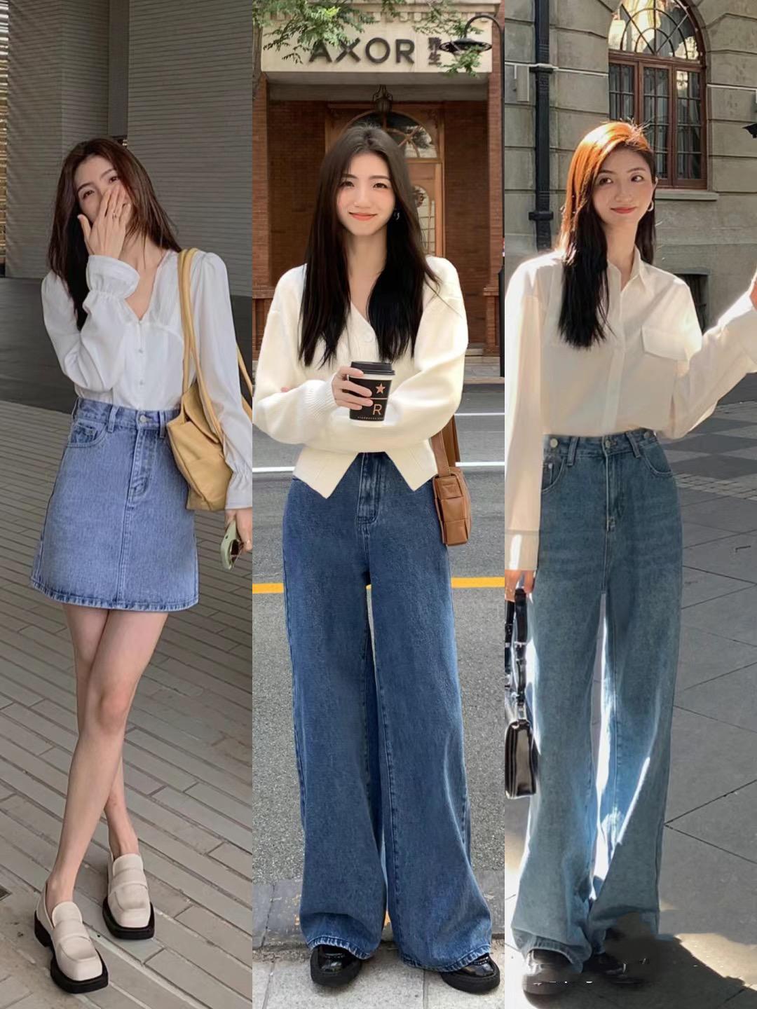 1、白襯衫+高腰牛仔褲/半身裙