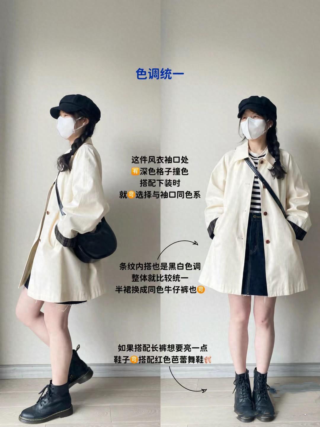 全身都是黑白色的組合,給人一種高級帥氣的美。尤其是米白色風衣的袖口、裝點了黑色翻邊的衣袖。剛好與條紋打底衫、黑色揹包、短裙、短靴實現了色彩呼應,更加大方協調。