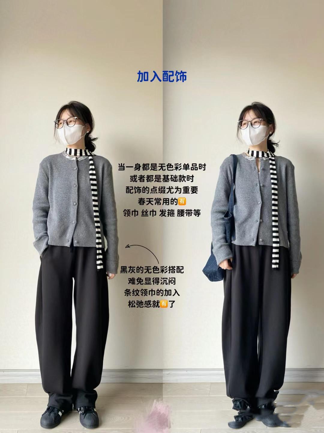 春天裏的絲巾、髮箍、腰帶,都可以成爲很好的配飾。比如一身黑灰色的穿搭,加入條紋領巾後就擁有了鬆弛感、時髦又耐看。