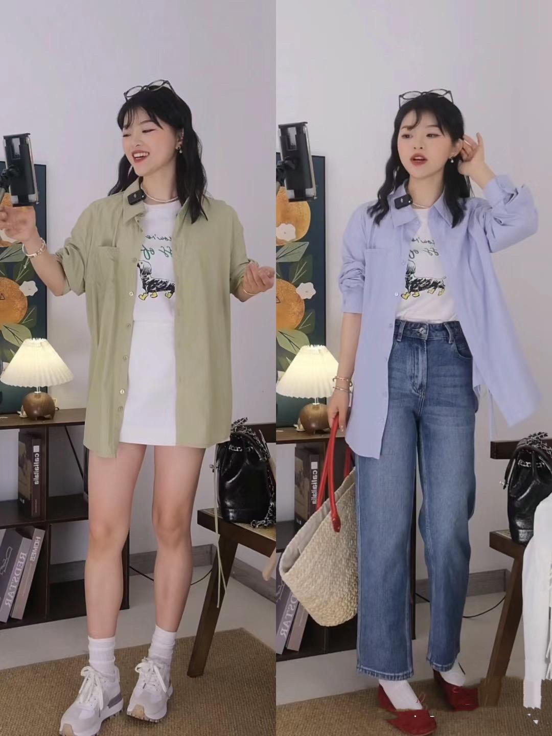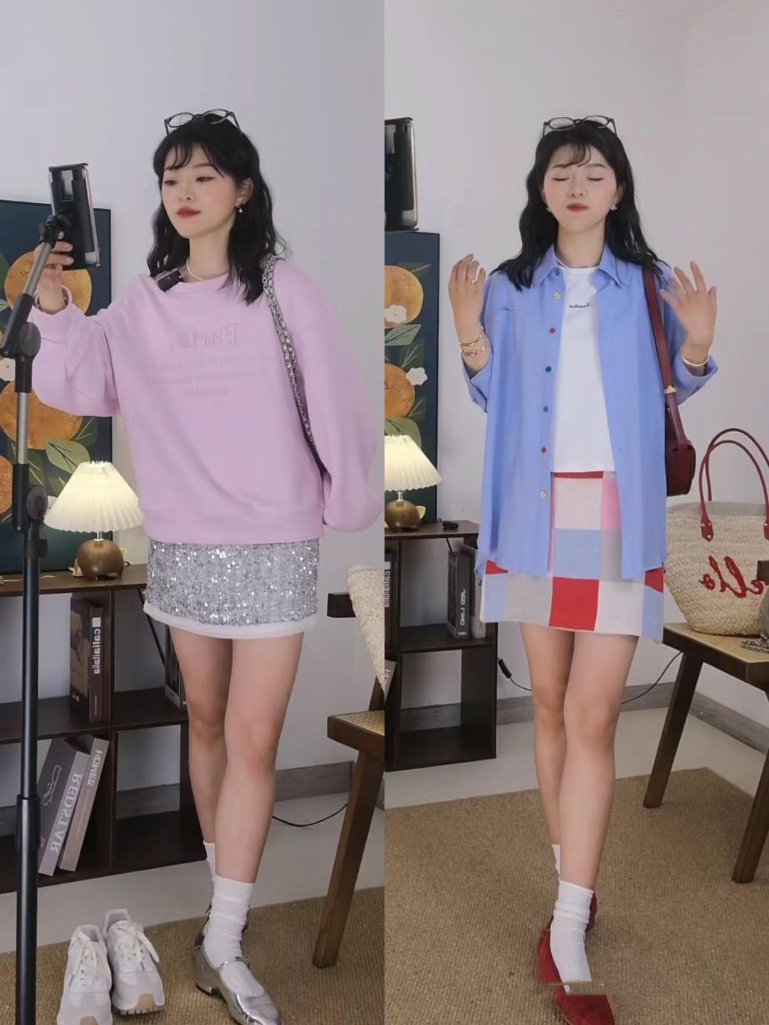 白色T恤與藍色襯衫的疊穿,可以中和掉撞色短裙的花哨。而且撞色短裙的色彩並不會很凌亂,同時也與服裝色彩做到了呼應。藍色襯衫作爲小外套穿着,也很提氣質。