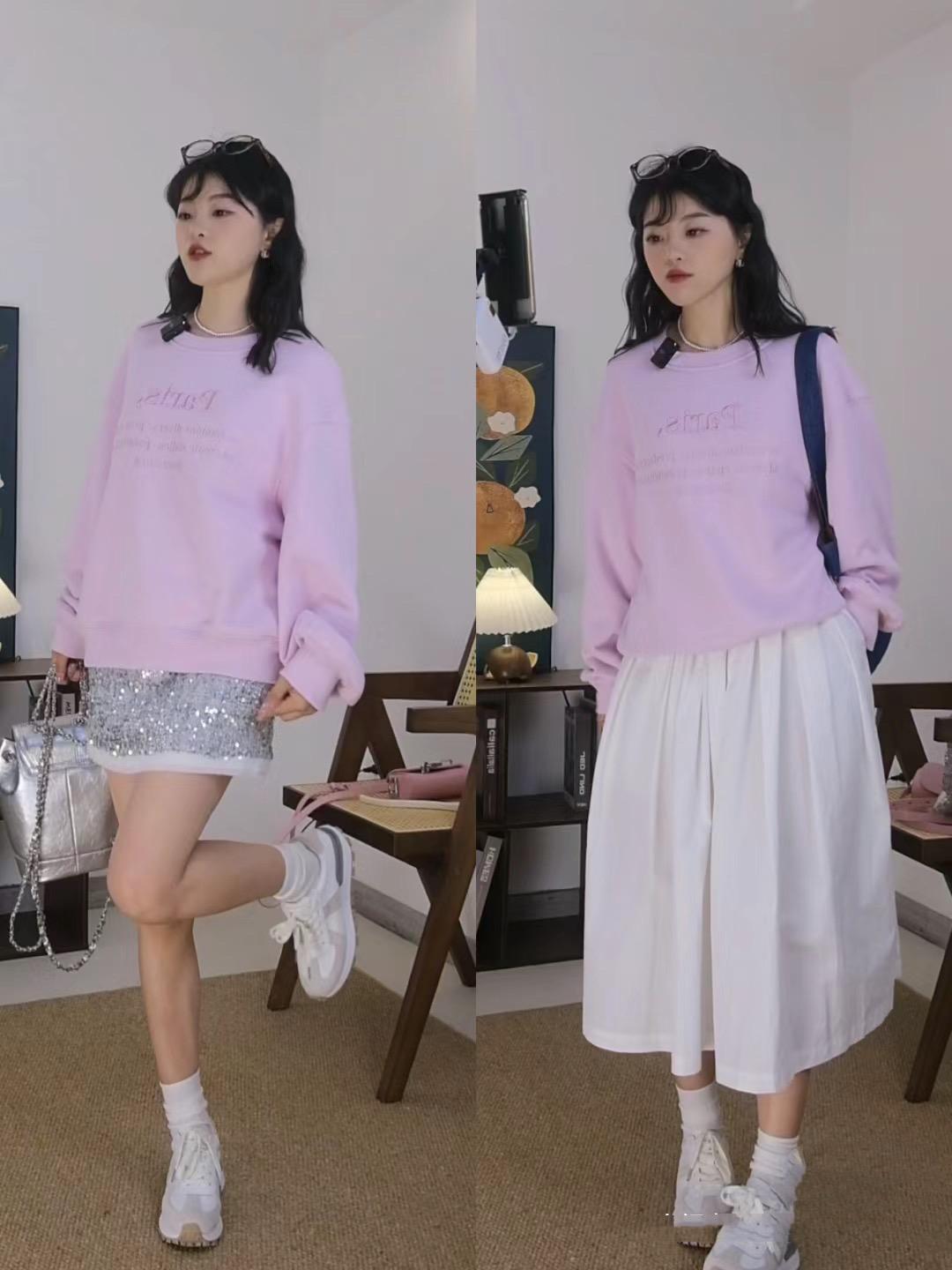 基礎的款式,亮色的點綴,既層次清晰又時髦精緻。比如粉色系的針織衫,疊搭白色T恤,就有一種更加清爽的力量。