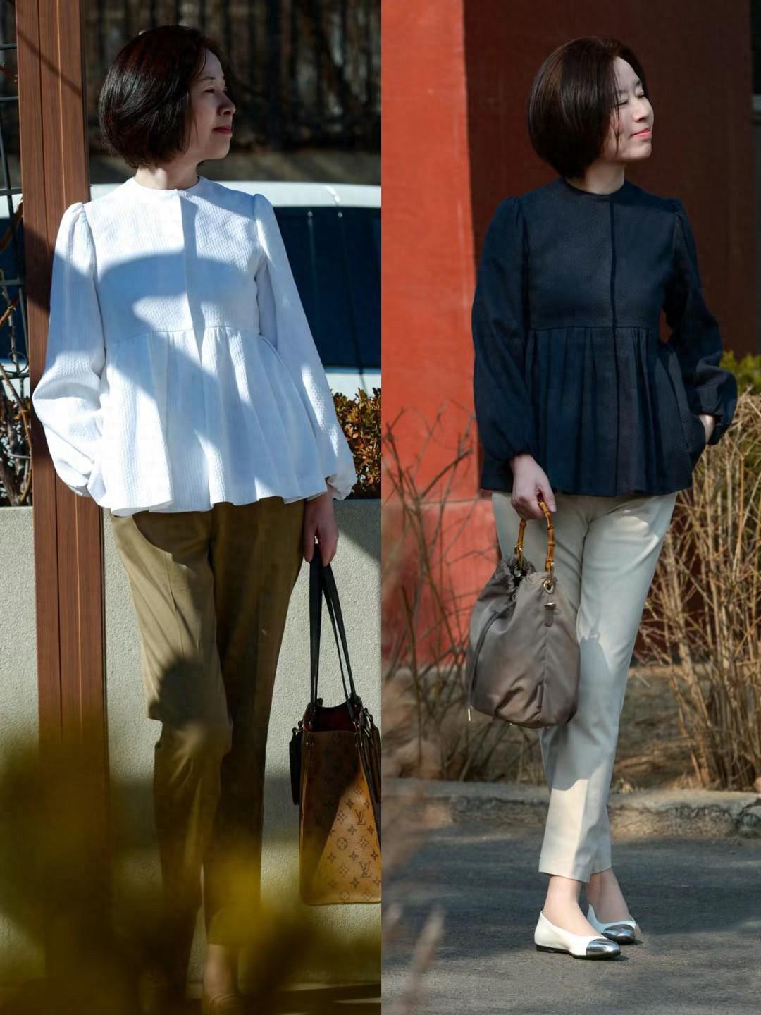 我們用白色系的小香風外套來疊搭藍色飄帶襯衫,這種藍白配色、一看就很高級、也比較顯氣質。白色小香風外套稍微寬鬆的版型,搭配黑色西裝褲更顯幹練。