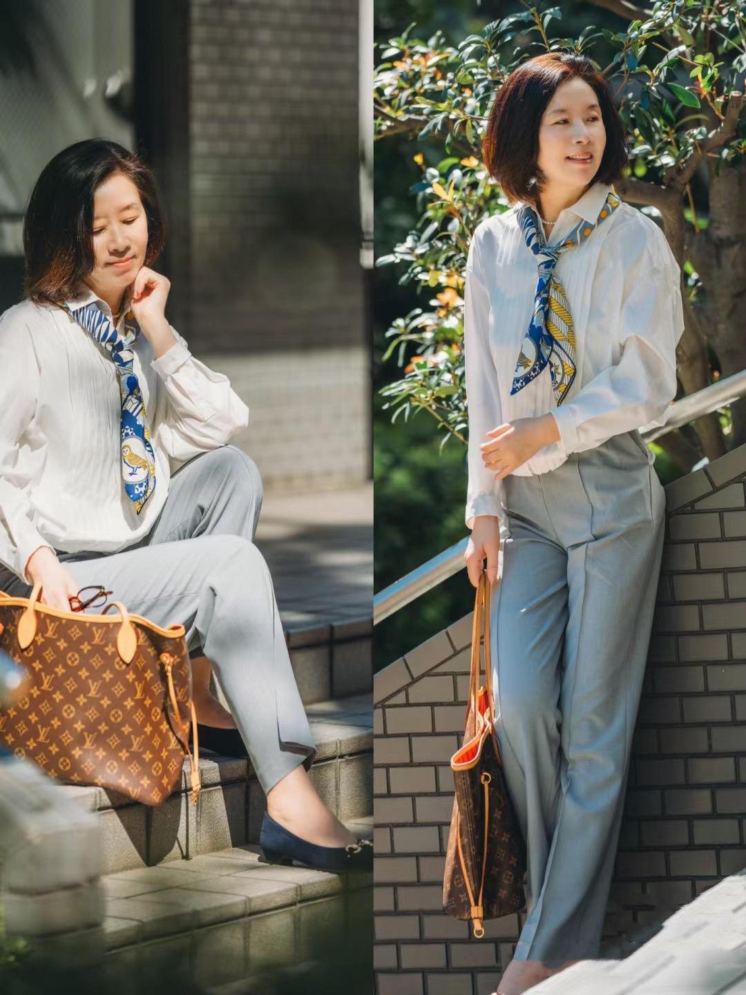 稍微簡約的白色襯衫,我們可以搭配西裝褲穿着,利落幹練的組合很優雅也很有氣質。像這種色彩明亮的絲巾,點綴在白色襯衫上,給人一種很高級的美。絲巾的點綴,也凸顯出女性的浪漫優雅。