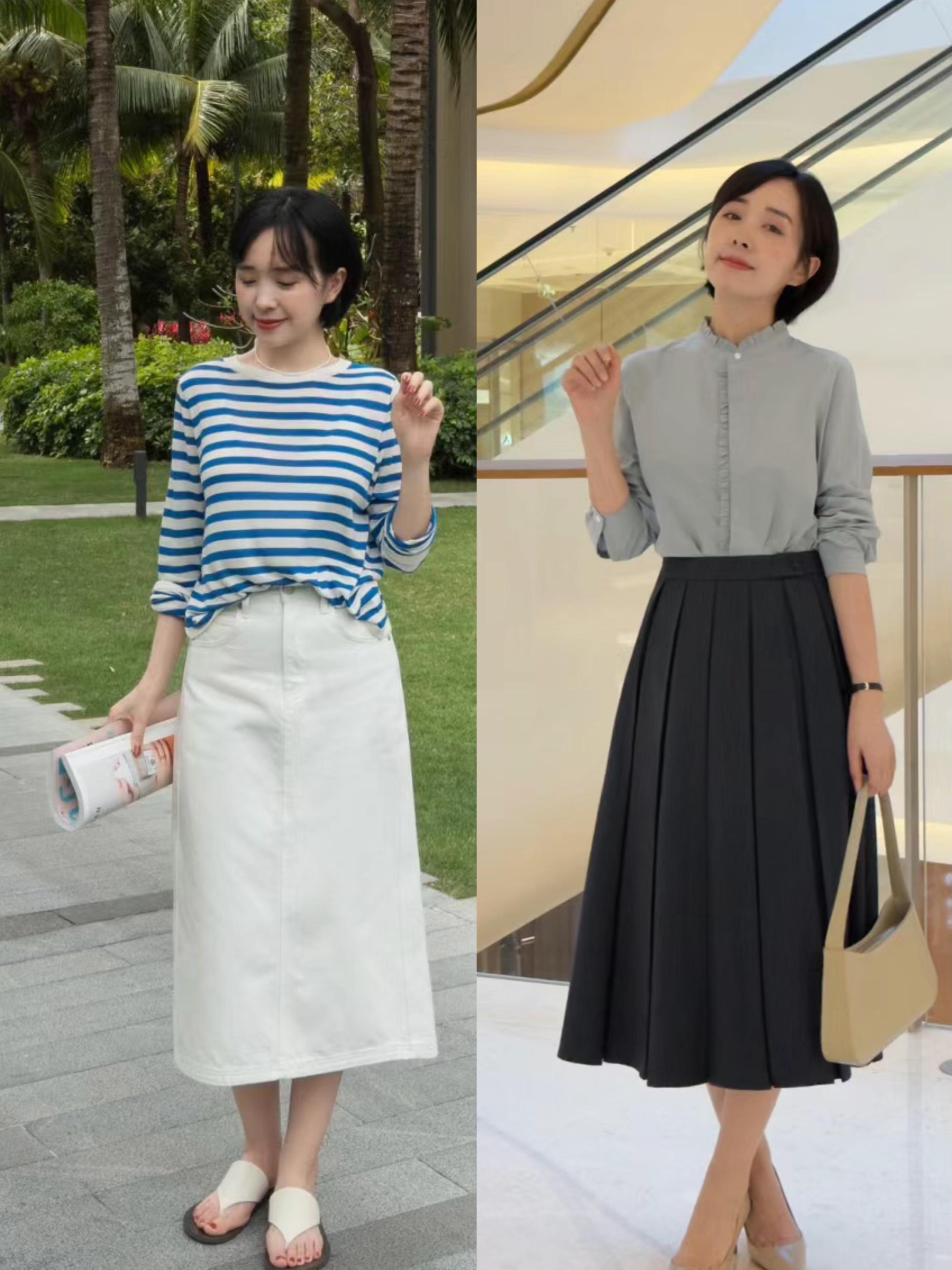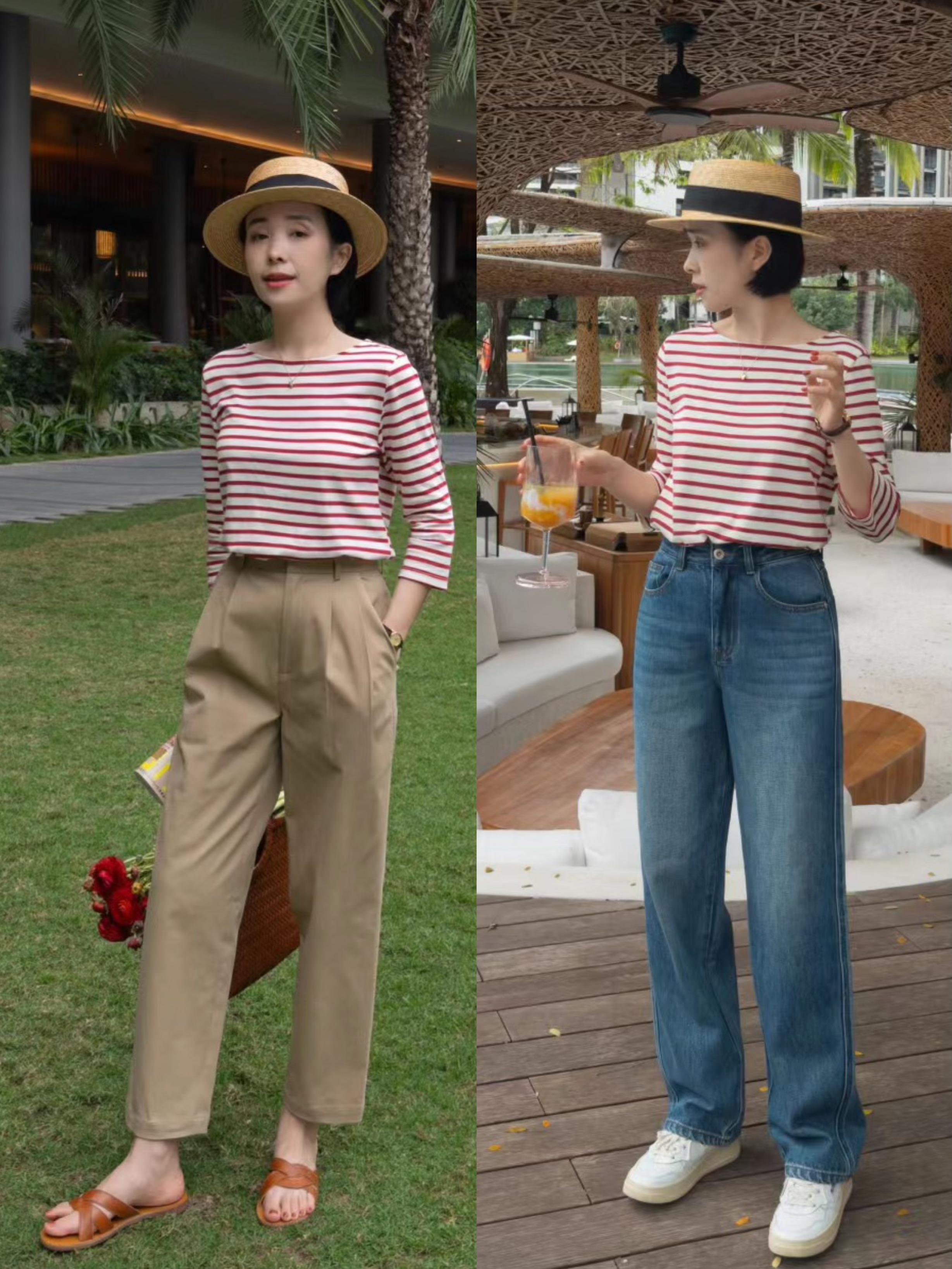 像這種條紋打底衫,我們可以配煙管褲或者半身裙來穿着。搭配半身裙的話,儘量選擇過膝的長度,搭配煙管褲的話,也可以選擇九分褲的褲型,利落輕盈。