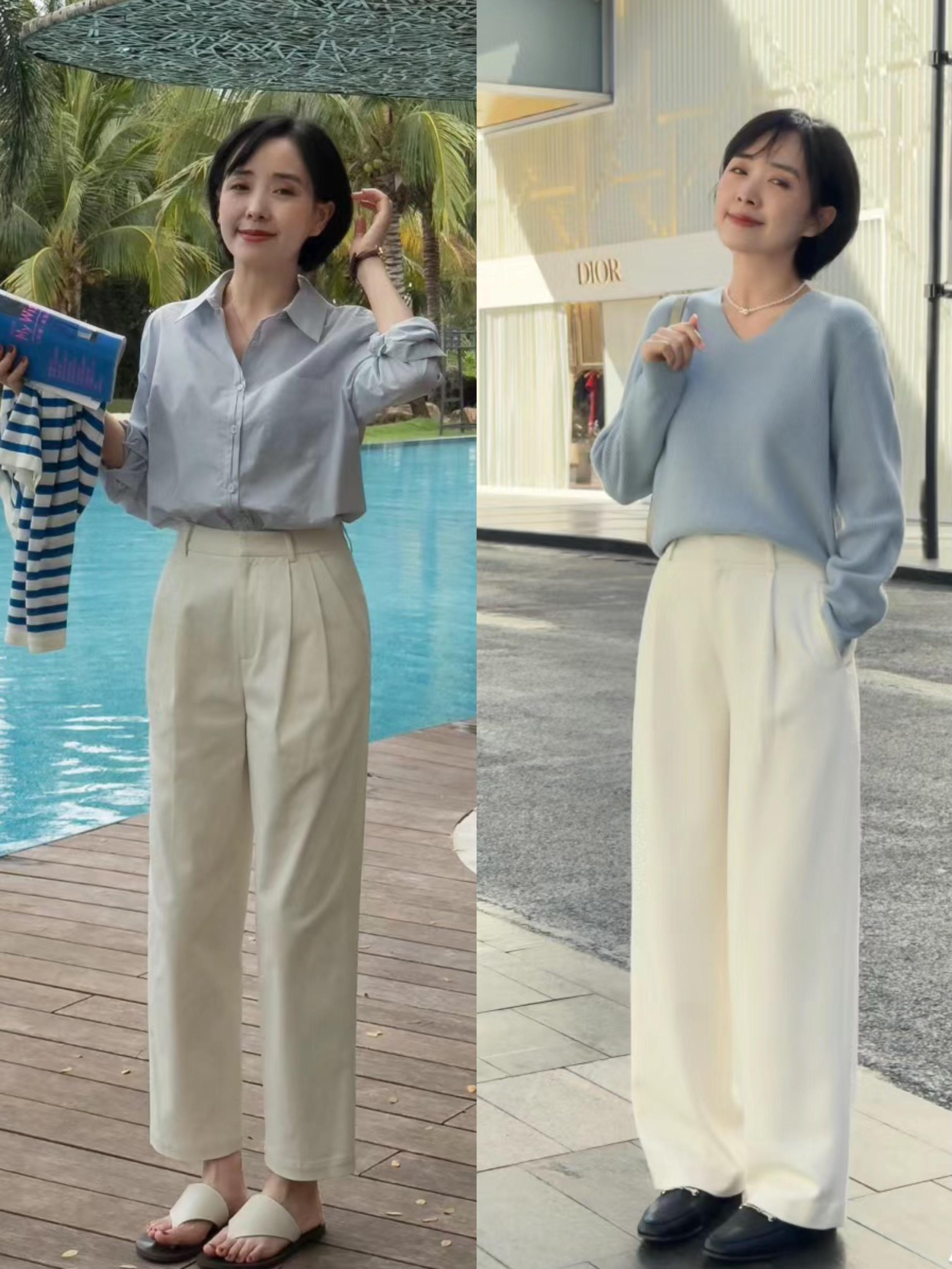細節上的精緻與考究,表現着女性內心的細膩與體面。高腰的白色長褲,或是寬鬆的褲筒、或是煙管褲的剪裁,都是比較修飾腿型又很體面大方的,配藍色襯衫/針織衫,溫柔嫺靜。