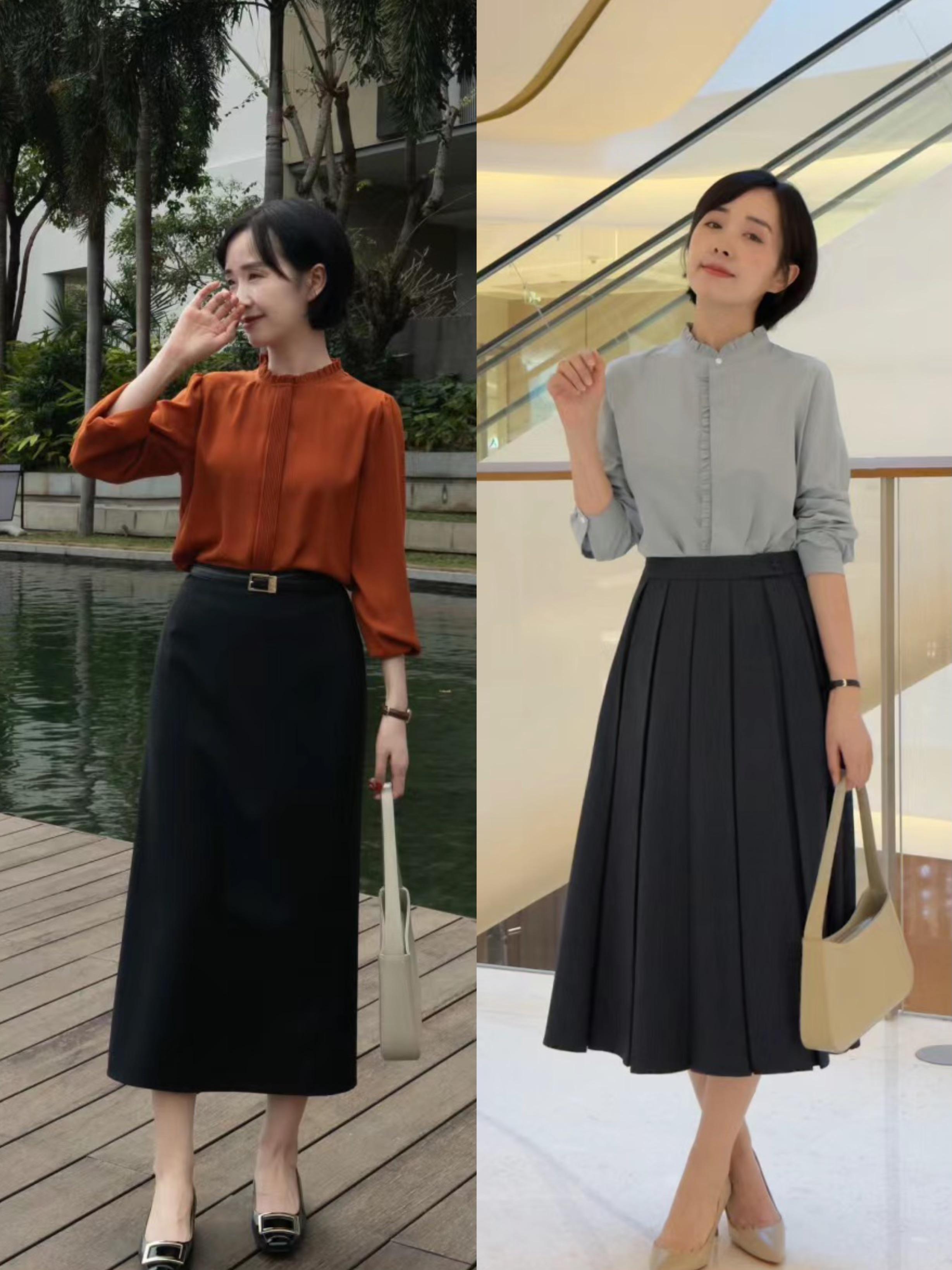 小巧精緻的木耳邊襯衫,可以選擇比較素雅或者顯白的顏色,都符合40+女性的定位。用木耳邊襯衫來搭配高腰的半身裙,抬高腰線又大方從容。