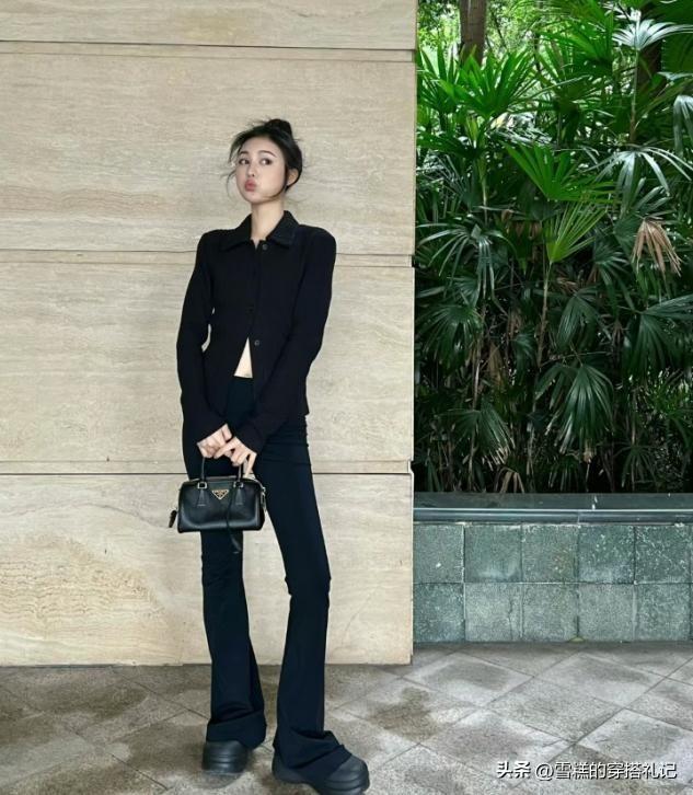 我們去訂立酒杯褲的穿衣設計方向,基本上還是要從線條的精緻感開始入手,衣服和褲子的配色都用基礎款,一套純黑色的組合來爲大家打樣,同一種顏色搭配的好處就在於,顏色的協調感不會讓單品顯得突兀,隨便一穿就是通勤的好料。