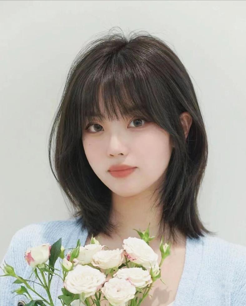 八字劉海髮量少些,但也能修飾下頜骨,髮尾外翹,活潑俏皮,扎個半丸子頭更減齡。