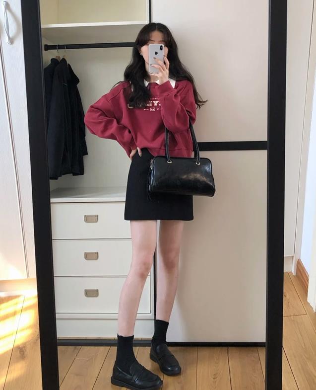 對於小個子女生來說,短衛衣穿起來可以拉長下身的比例,與高腰半裙相結合後,就更能營造出一種胸下全是腿的既視感。這種搭配比較適合身材嬌小的女生們,可以讓你在視覺上呈現出高挑感。