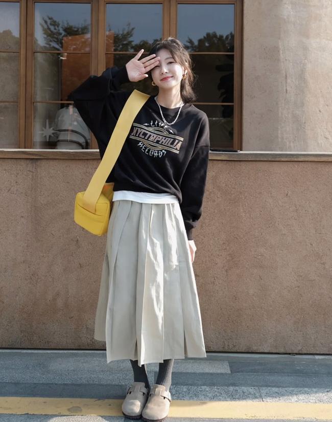 如果想要更出彩一些,那麼可以選擇對亮色混搭,不管是衛衣選亮色,還是裙子,都可以讓整個人看起來更出衆吸睛。