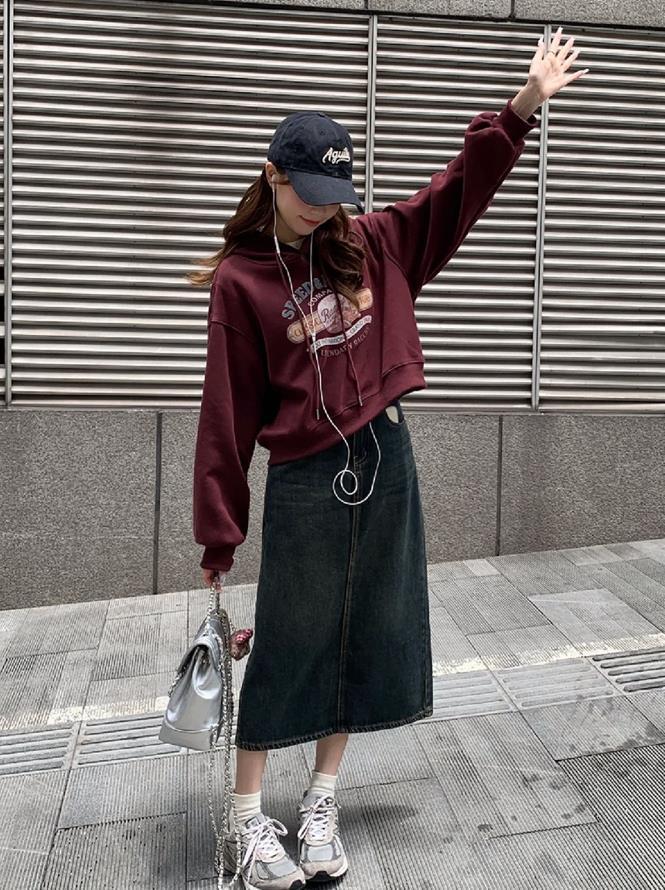 短衛衣配高腰半裙,是當下最流行的一種搭配,它可以展現出整個穿搭的青春活力氣息,還能打造出個性的造型。
