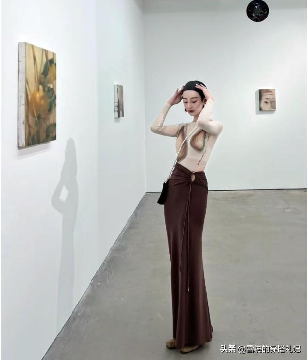 把握長裙線條的疊加方式,整體來說,最重要的是放大長裙在視覺中的佔比,比如短款上衣,儘量不要遮過腰線,選擇塞裙腰的方式,更能夠凸顯出長擺裙子的視覺優勢。