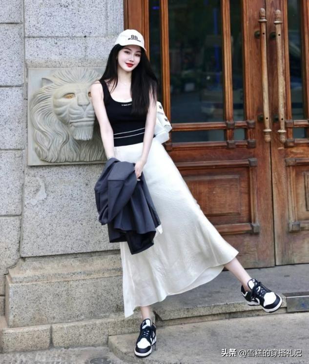 比較具有個性感的長裙穿法,除了在裙子的下襬上去展示出不對稱的線條感,還可以從配色上進行入手,最重要的是把彩色穿在上半身,用來提亮整體的視覺亮點,兩色對比更惹眼。