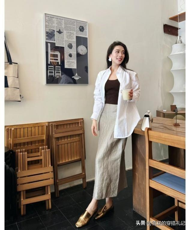 有時候穿搭直筒款式的長裙,身材的縱向延伸比例是非常到位的,而且不會放寬你的身材橫向線條,那麼用厚底鞋或者尖嘴鞋去延伸你的小腿曲線,稍微露一點腳踝也是非常挑高的。