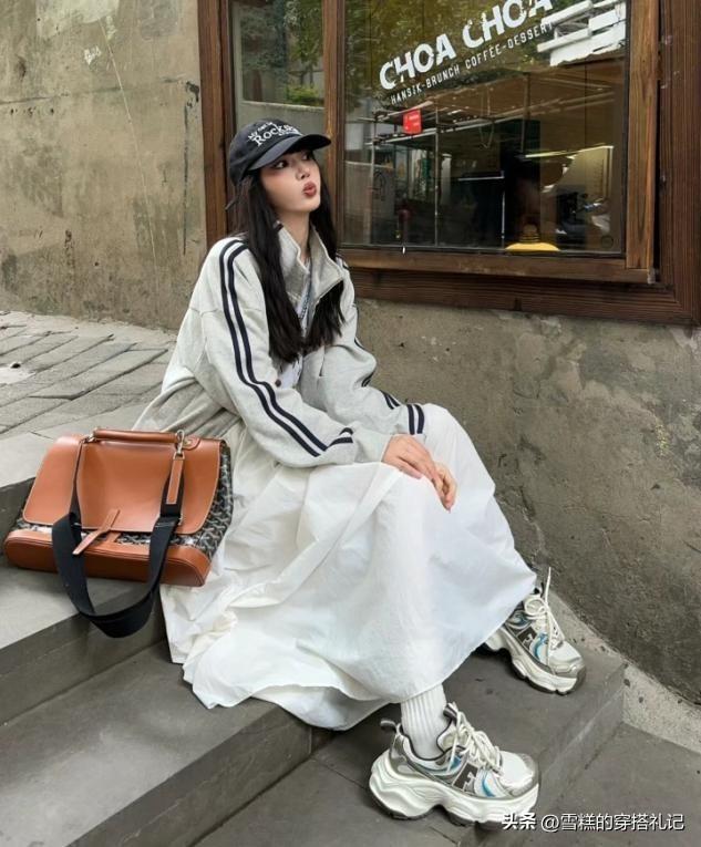 長裙的配色方法其實比較簡單,很多時候,爲了避免膨脹感,我們會用單色系的裙子去弱化裙襬的橫向輪廓,與外套的同色系組合,其實更具有順暢感。