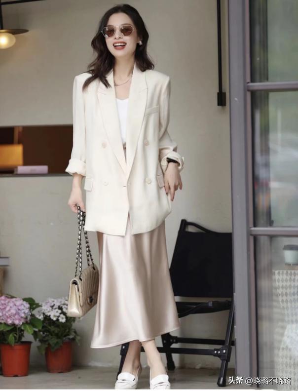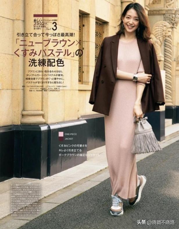 淡粉色的裙子不僅給人帶來視覺上的舒適感,展現出極致的溫和與柔美,而且可以讓膚色看起來更加純淨,尤其適合黃皮膚女生穿着,能夠有效提亮面部膚色,營造出清新亮麗的效果。深色系外套在視覺上具有引人注目的獨特優勢,其中黑色和棕色尤爲突出,能有效縮減身材輪廓的寬度。