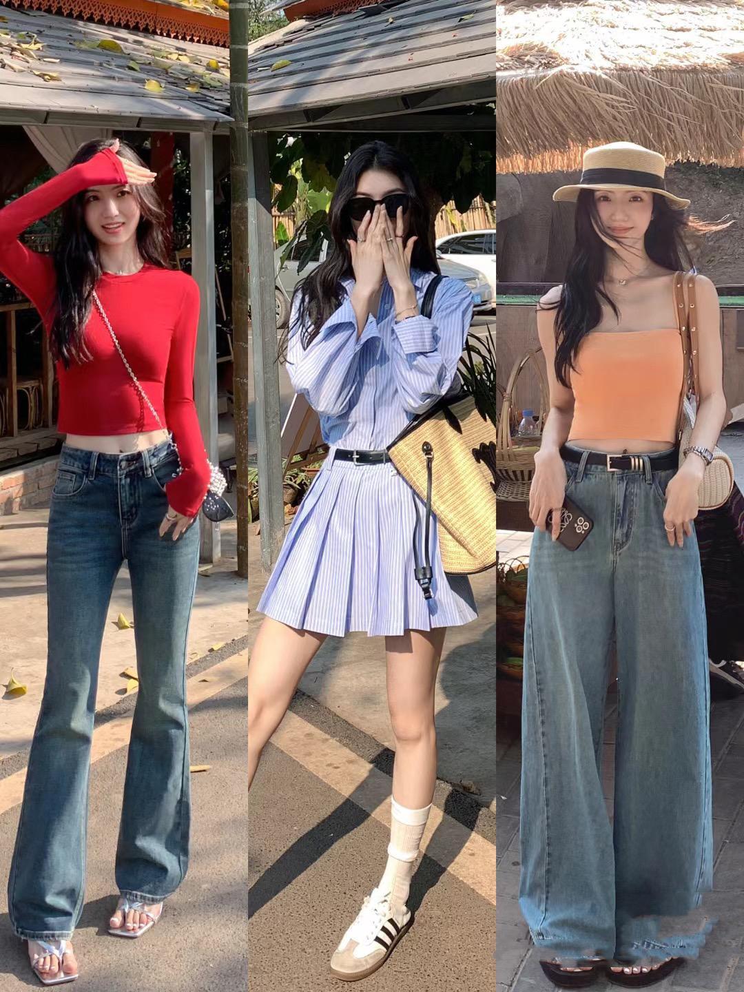 修身的粉色針織開衫,我們可以配水洗藍的直筒牛仔褲穿着。直筒牛仔褲版型挺闊、面料輕薄,穿起來大方不厚重,更加符合春季氛圍。