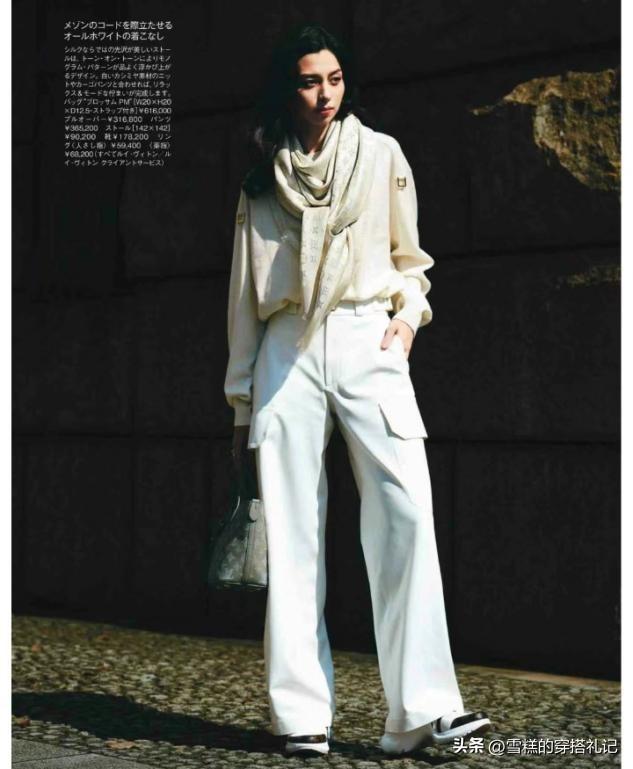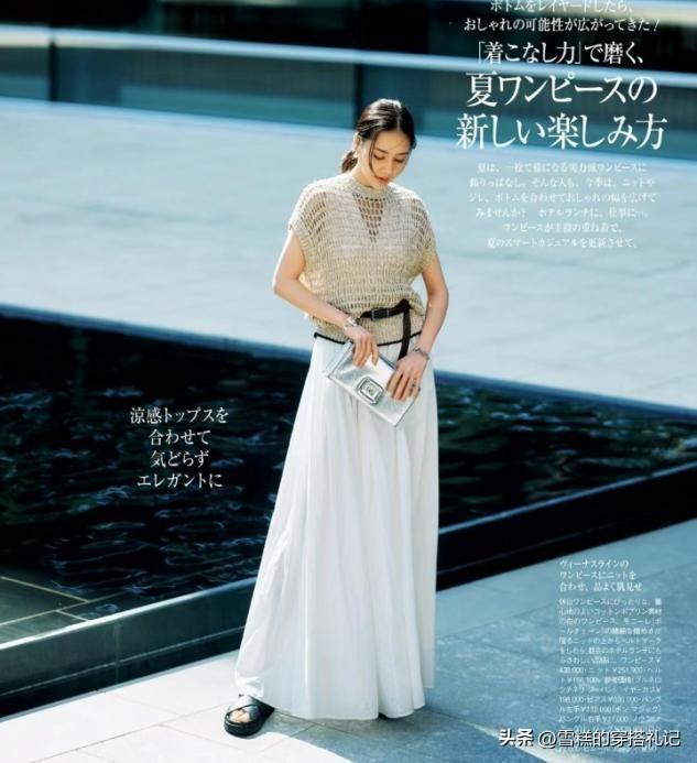 比較輕盈面料的雪紡裙裝,我們會選擇利用加長款式的半身裙來作爲推薦,配色的選擇可以參考圖中這種白色或者米色系,視覺上的提亮效果特別好,而且可以用來組合針織款式的上衣,穿出早春的視覺清爽性。