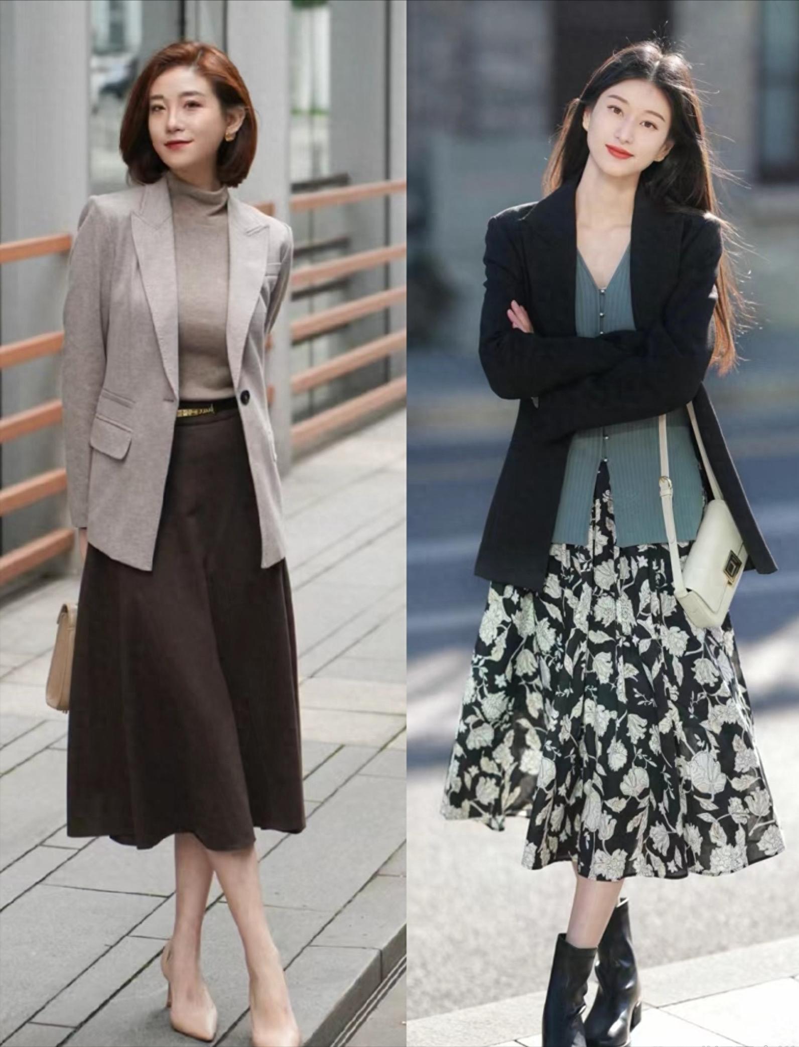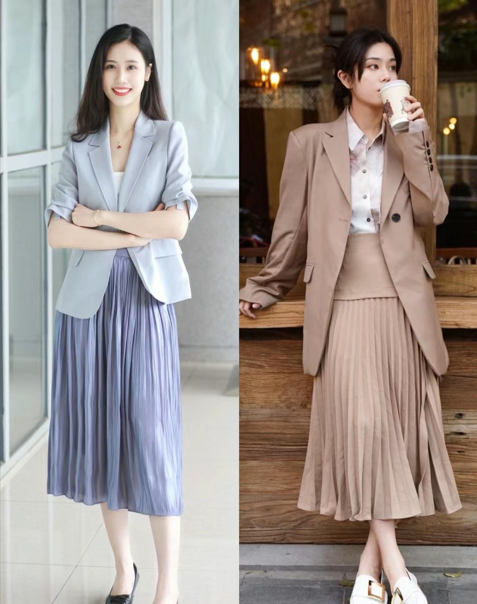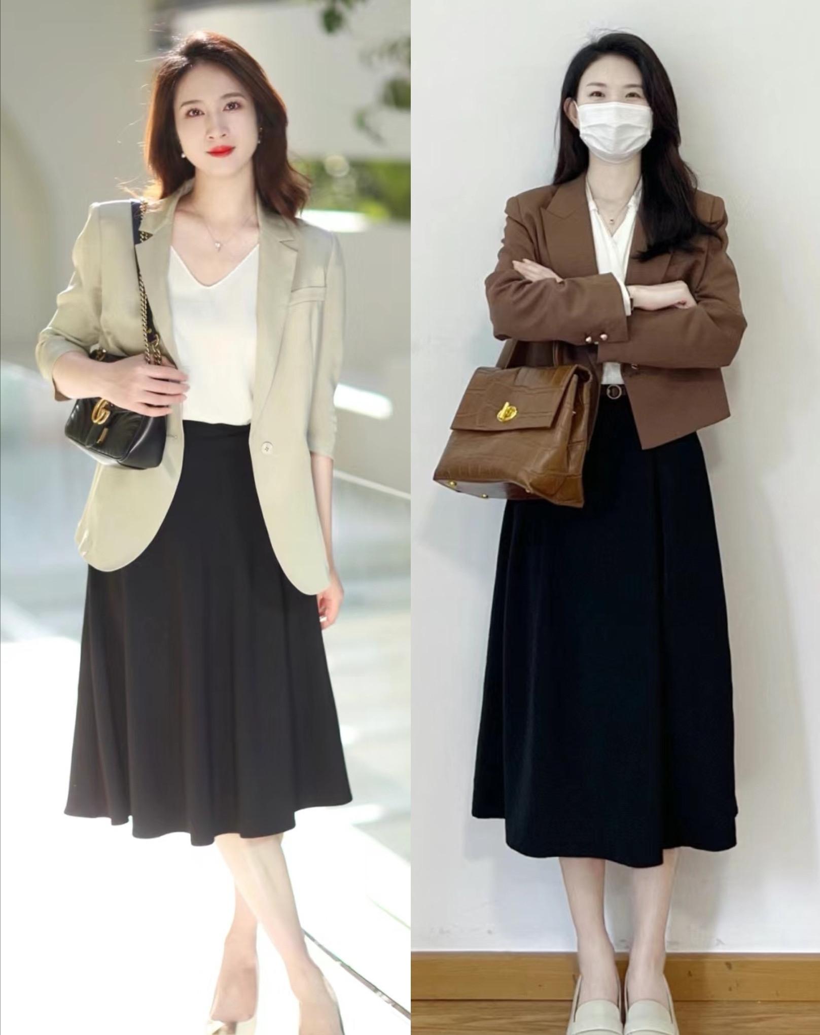 如果說有沒有什麼萬能組合,優雅高級又不挑人。那麼西裝+半身裙,就是最合適的選擇。想要一種優雅高級、體面大氣的美,我們可以選擇同色系的搭配。