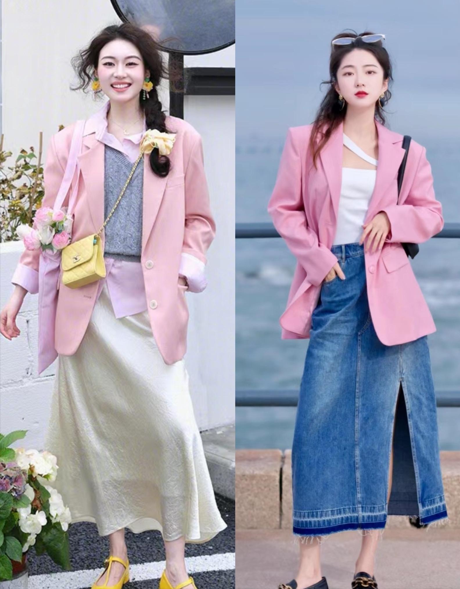 西服外套百搭不挑人,可以與各種風格的裙裝組合搭配。高腰的牛仔半身裙,配上淺粉色的西服外套,也有一種青春體面的美。